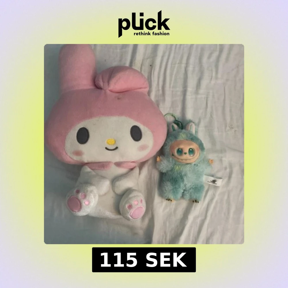 Bilden visar två gosedjur/leksaker: en stor My Melody-plush från Sanrio och en mindre blå plyschfigur med gröna ögon och kaninöron. Båda ser mjuka ut och är i begagnat skick, men inga tydliga elektronikprodukter syns.