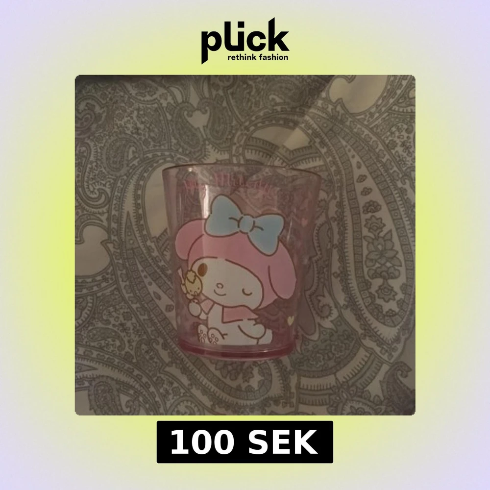 Söt rosa plastmugg med My Melody-motiv från Sanrio. Muggen har två olika illustrationer av My Melody med blå rosett och hjärtan. Produkten ser ut att vara i gott skick utan synligt slitage eller repor. Perfekt för fans av kawaii och Sanrio-karaktärer.finns en liten spricka