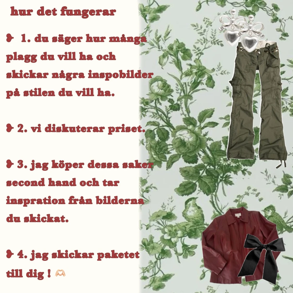 hej, jag heter mira och vill börja ta beställningar på ”mystery thrift style - bundle” där jag hjälper dig att hitta snygga, second hand - kläder som passar din stil. 🫶🏻🍏 fråga om det är något ! ❤️