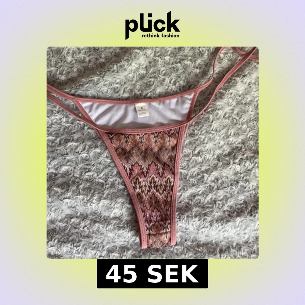 Säljer en snygg bikiniunderdel i storlek S. Den har ett unikt mönster i rosa och beige toner med smala band i sidorna. Materialet är 100% polyester. Aldrig använd.