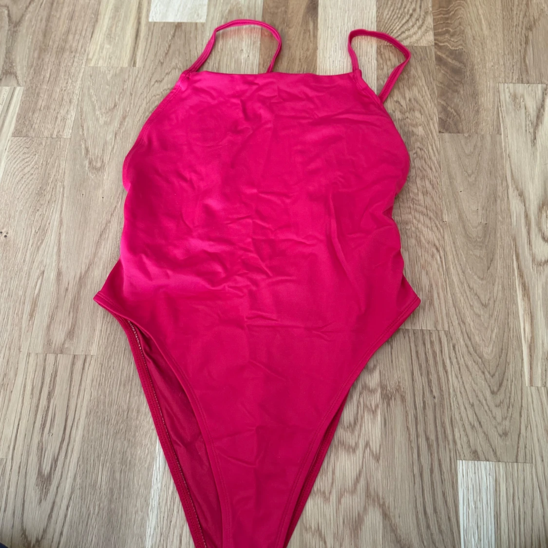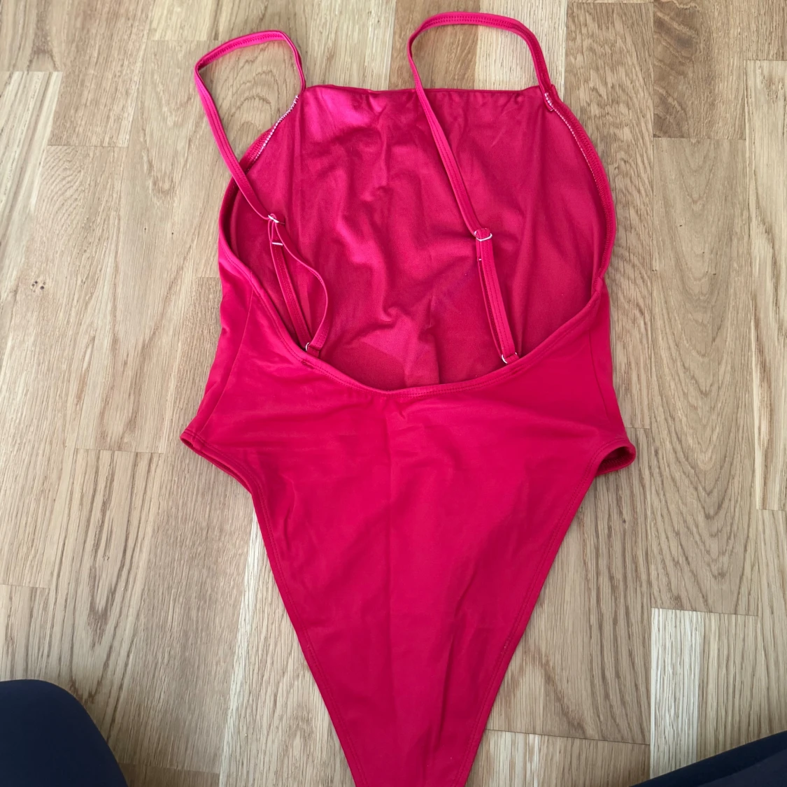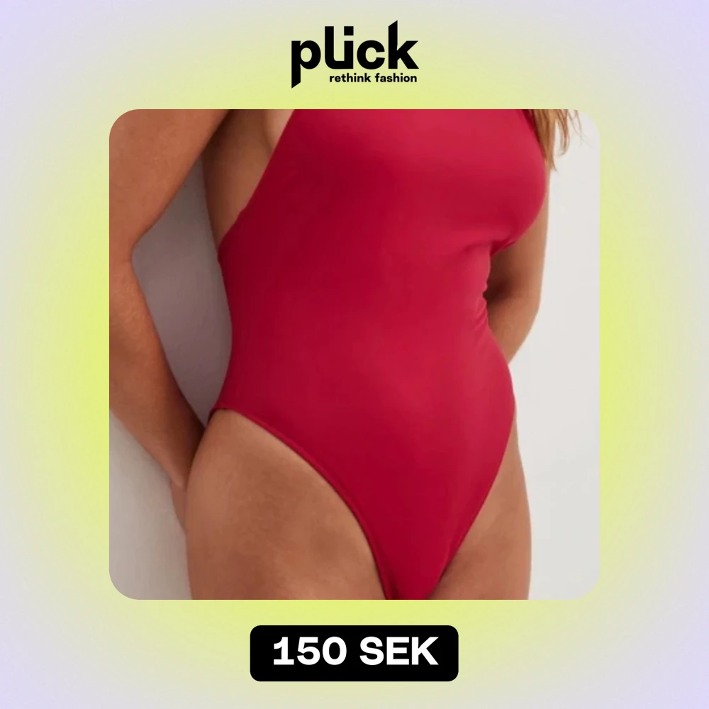 Säljer en snygg röd baddräkt med smala axelband och öppen rygg. Perfekt för sommardagar på stranden eller vid poolen. Den har en enkel och stilren design som ger en tight passform.