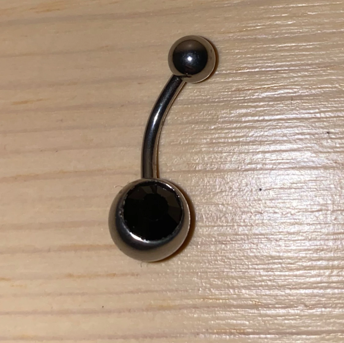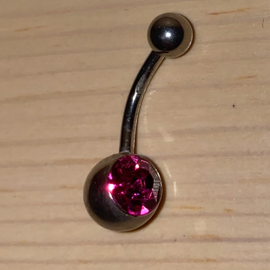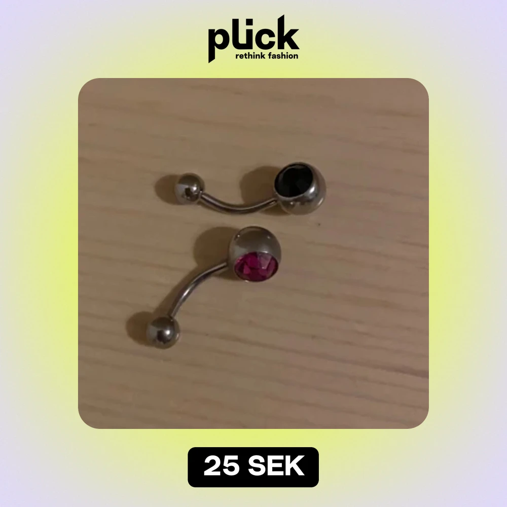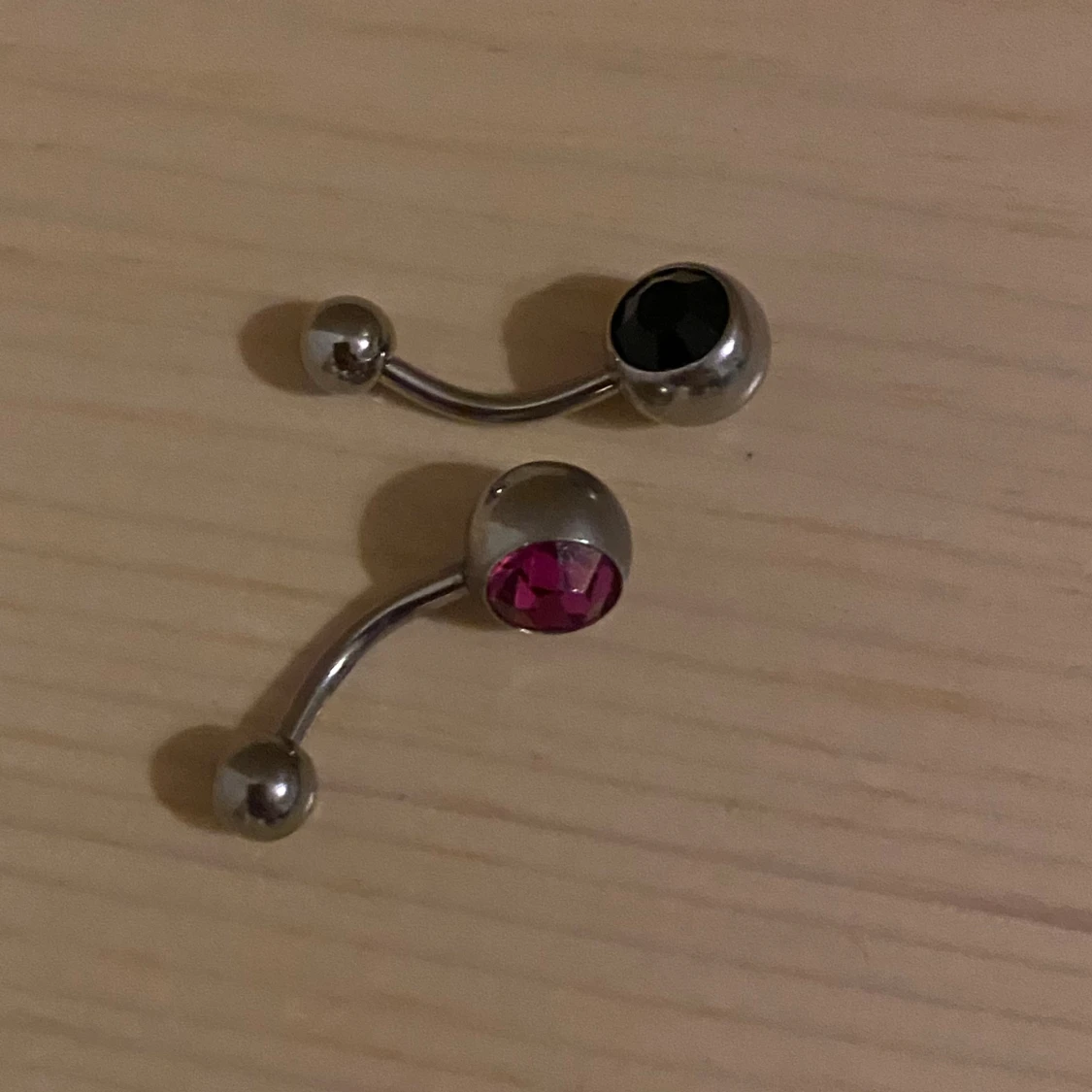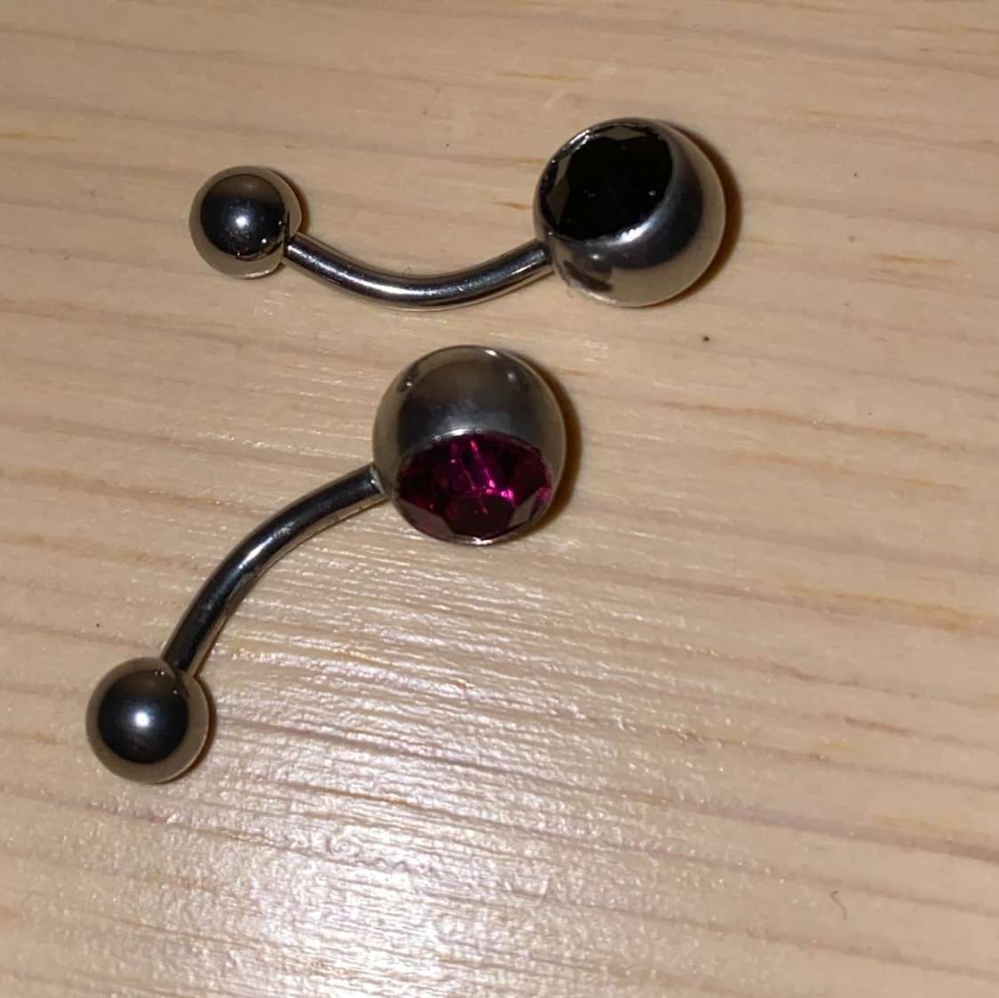 2 stycken navelpiercing. Ena med en svart Sten och den andra har en rosa sten.