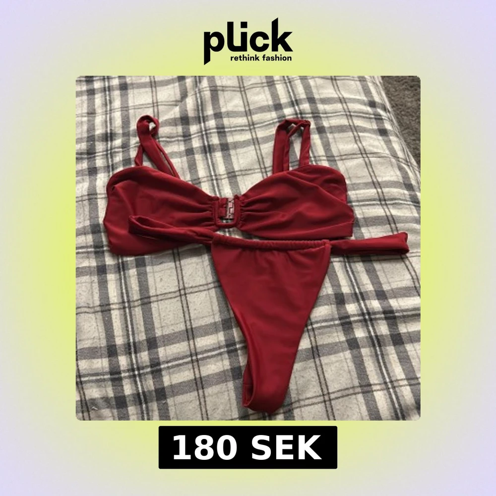 Snygg röd bikini med ett dekorativt spänne framtill. Överdelen har breda axelband och en stilren design. Underdelen är enkel och matchar toppen perfekt. Perfekt för en dag på stranden eller vid poolen.