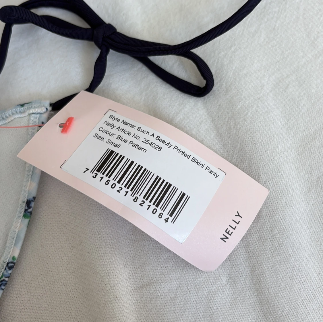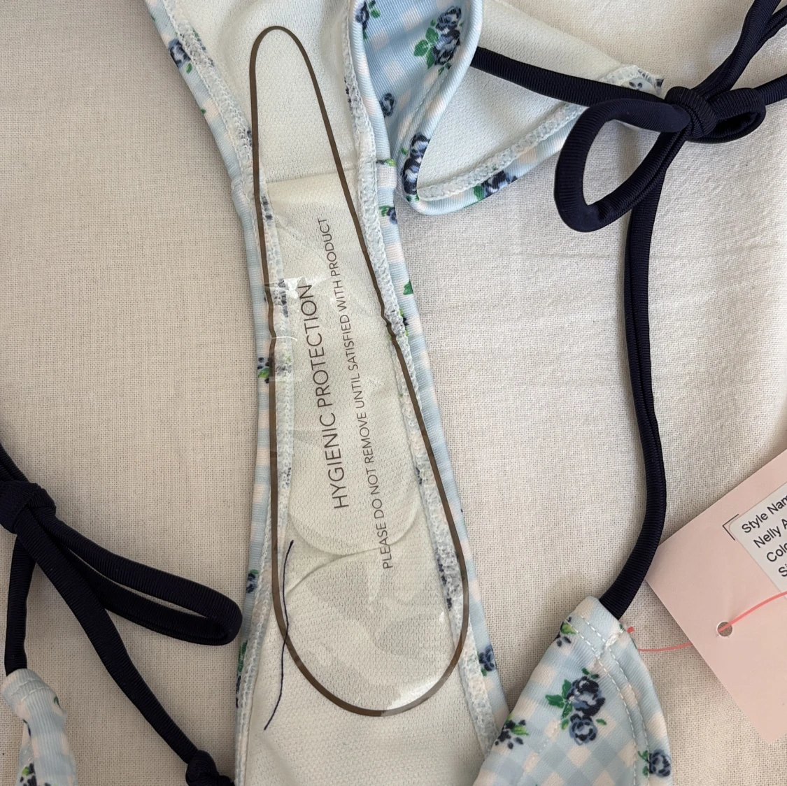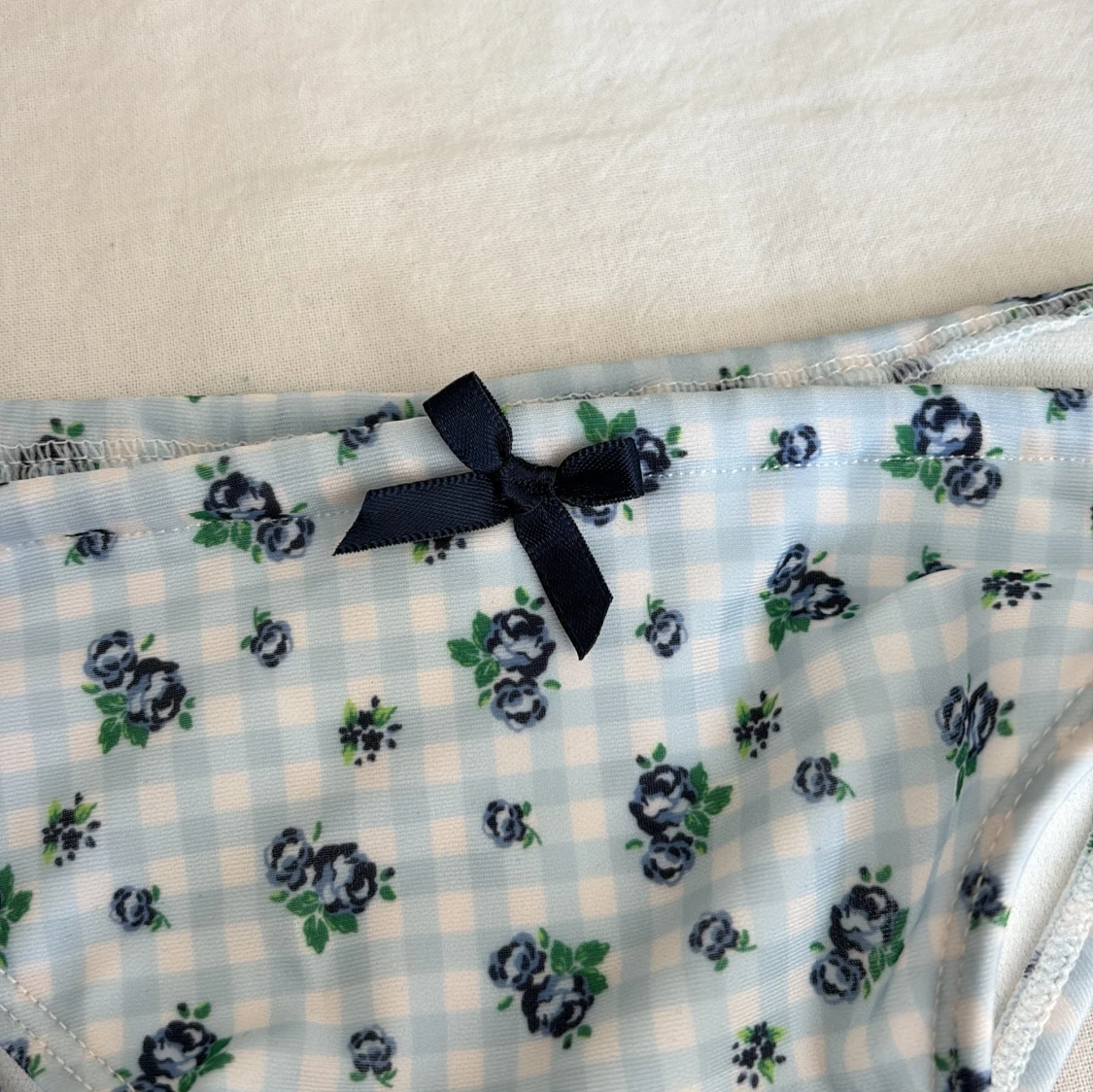 Supersöt bikiniunderdel från Nelly med ljusblått rutmönster och små blå blommor. Sidorna har svarta knytband och framtill sitter en liten rosett. Perfekt för stranden och sommarens alla bad.
