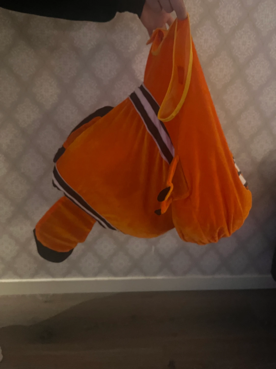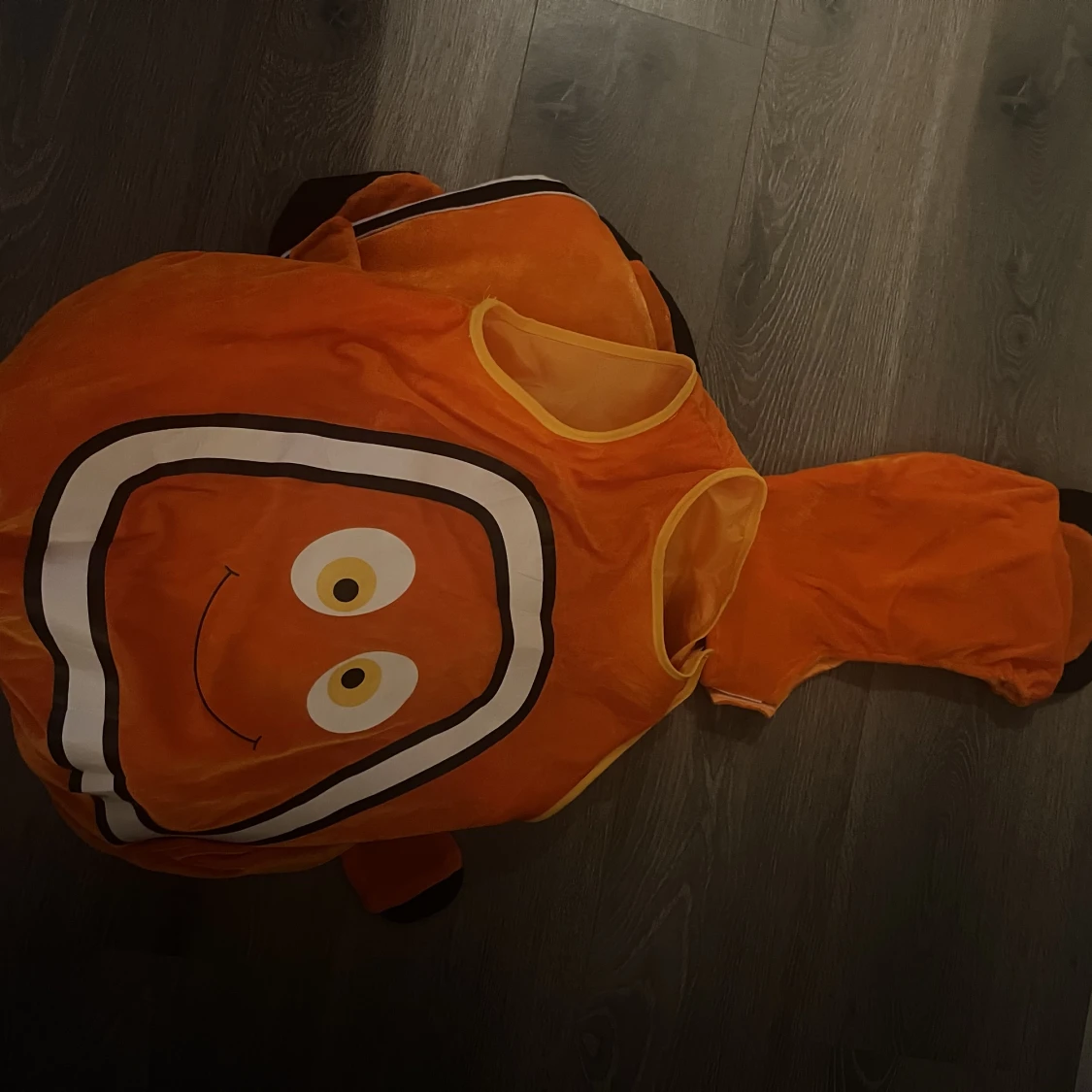 säljer en oanvänd hitta nemo kostym som skulle varit till en maskerad men kom försent. de är en oklar storlek men de passar både till barn och till mig som är 21 år som en tröja. Den kostar 500 ny