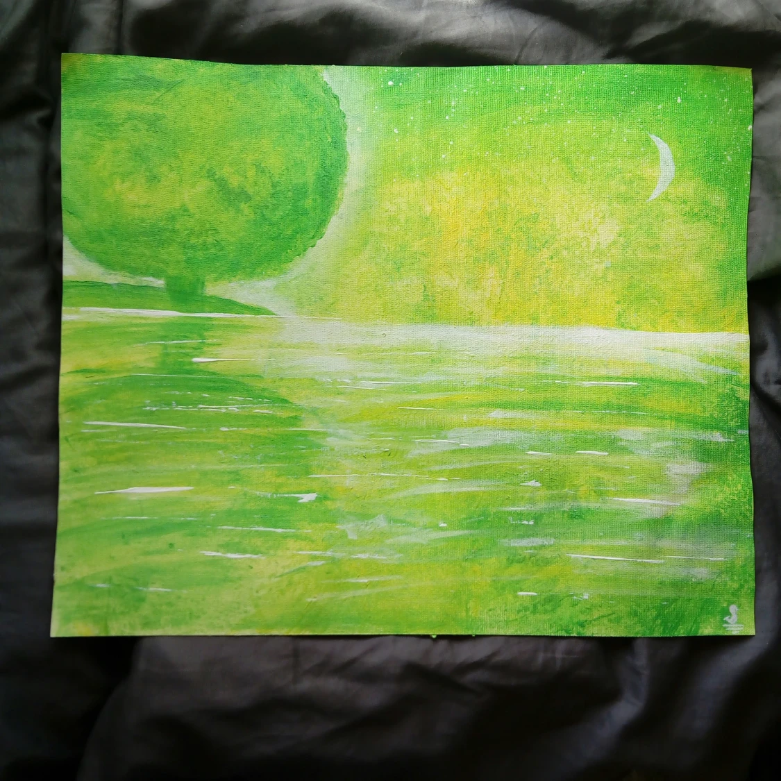 En vacker grön målning med träd och vatten. På kanvasduk. Orginalmålning