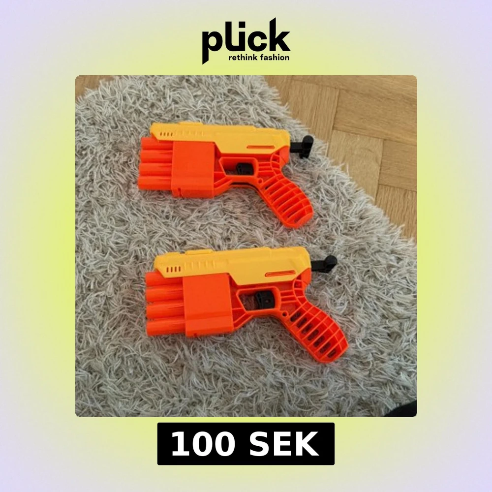 Två Nerf Elite 4-dart blasters i orange och gult. Båda i fint skick utan synligt slitage. Perfekt för roliga Nerf-strider hemma eller utomhus. Lätta att ladda och använda, passar både barn och vuxna. Dartpilar ingår ej.