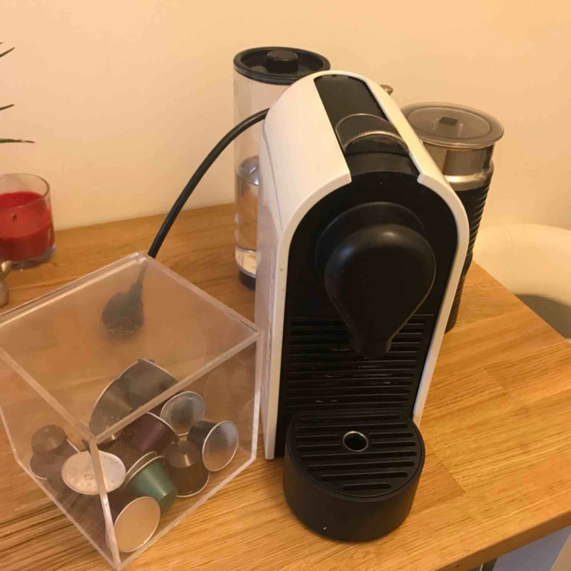 - Cremevit Nespresso maskin med inbyggd mjölkskummare (både varm & kall) - Box för förvaring av kapslar. Fungerar felfritt! Perfekt för mindre hushåll. Finns i Vasastan, Stockholm.