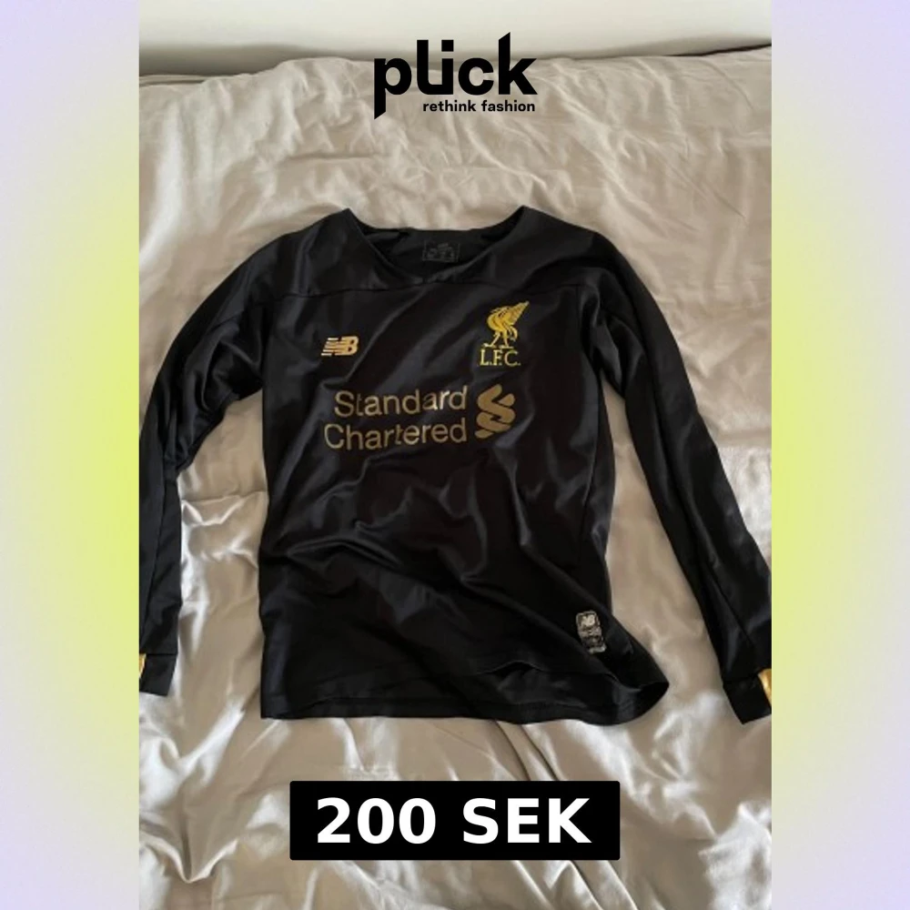 Säljer en svart långärmad Liverpool målvaktströja från New Balance med guldiga detaljer och tryck. Framsidan har LFC-logga och Standard Chartered, baksidan har A. Becker och nummer 1. Materialet är lätt och andas, perfekt för fotbollsträning eller match.