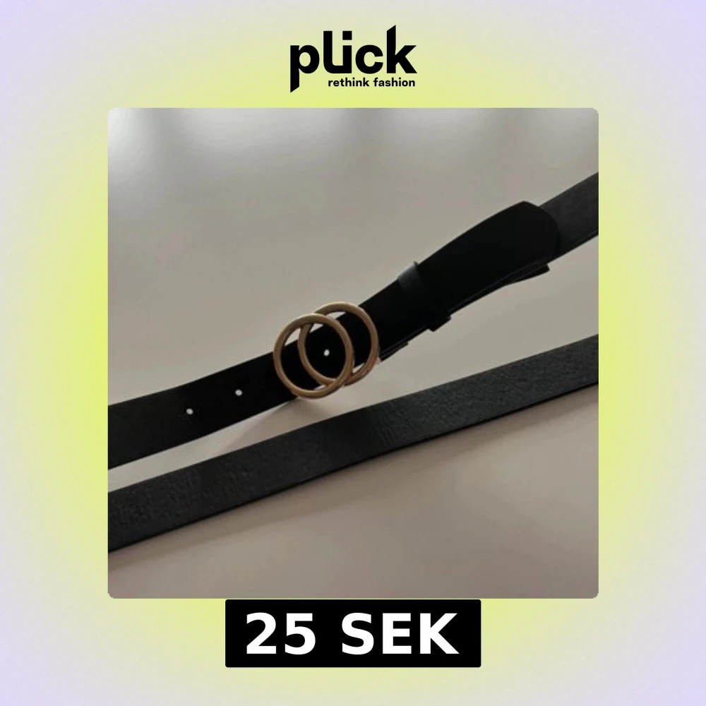 Stilrent svart bälte med ett snyggt spänne i form av två guldfärgade ringar. Bältet är slätt och har fem hål för justering. Materialet är skinnimitation och perfekt för att lyfta din outfit med en cool detalj. 85 cm (33 inch)
