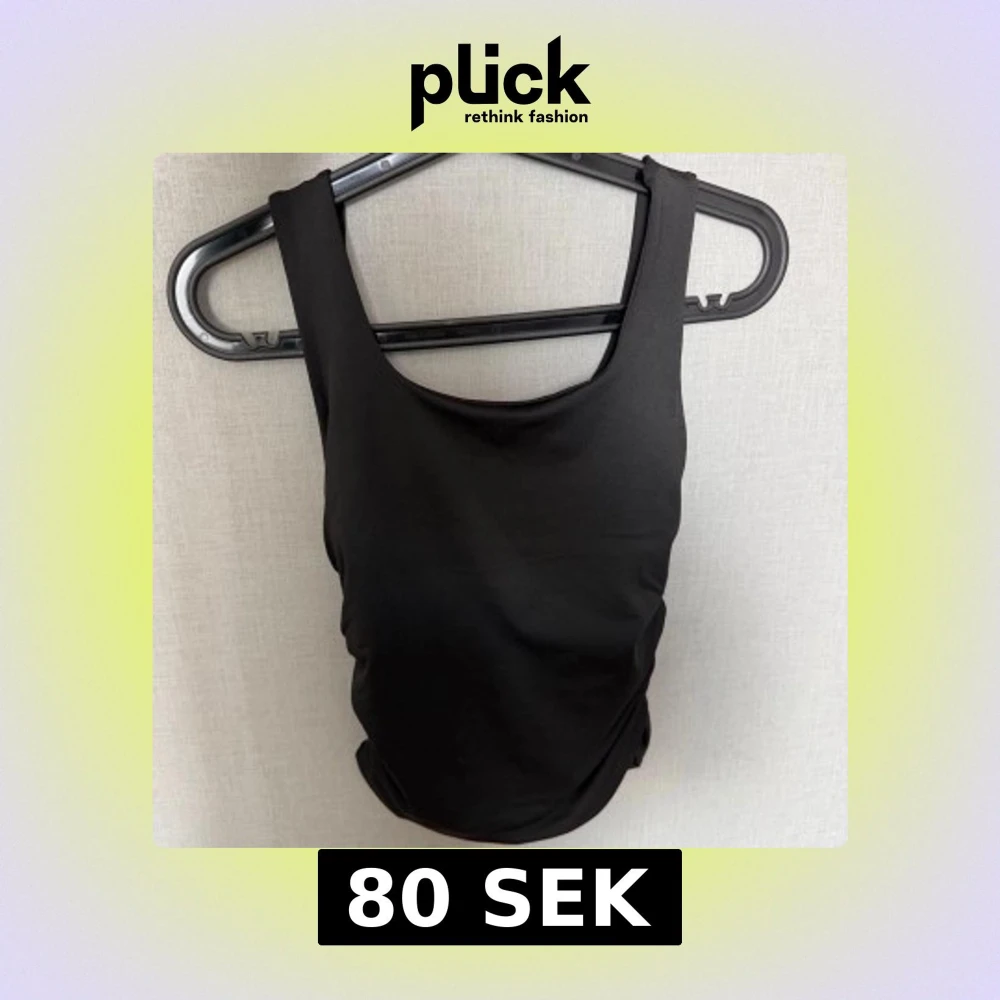 Säljer en stilren svart topp med breda axelband och rynkade sidor som ger en snygg passform. Klassisk modell med rundad halsringning både fram och bak. Oanvänd