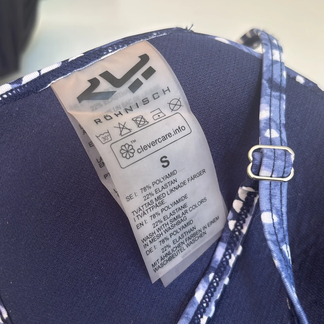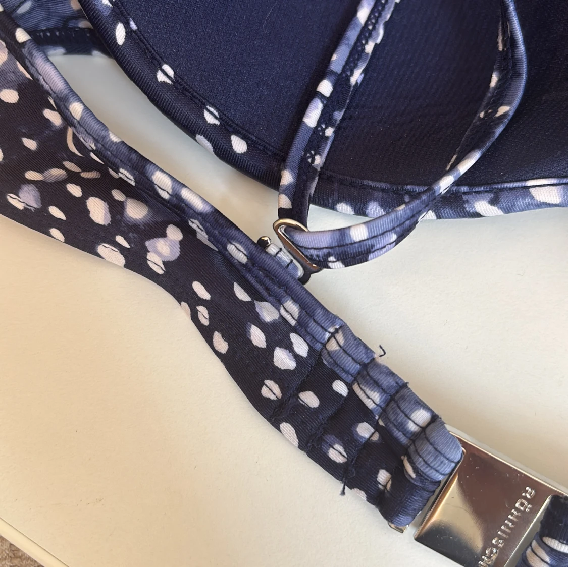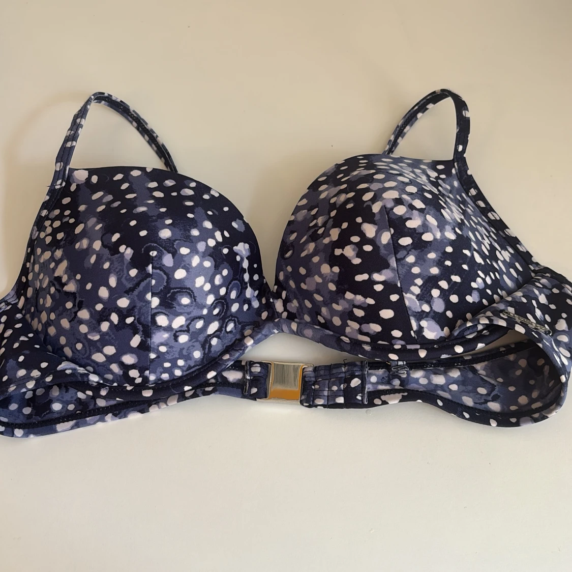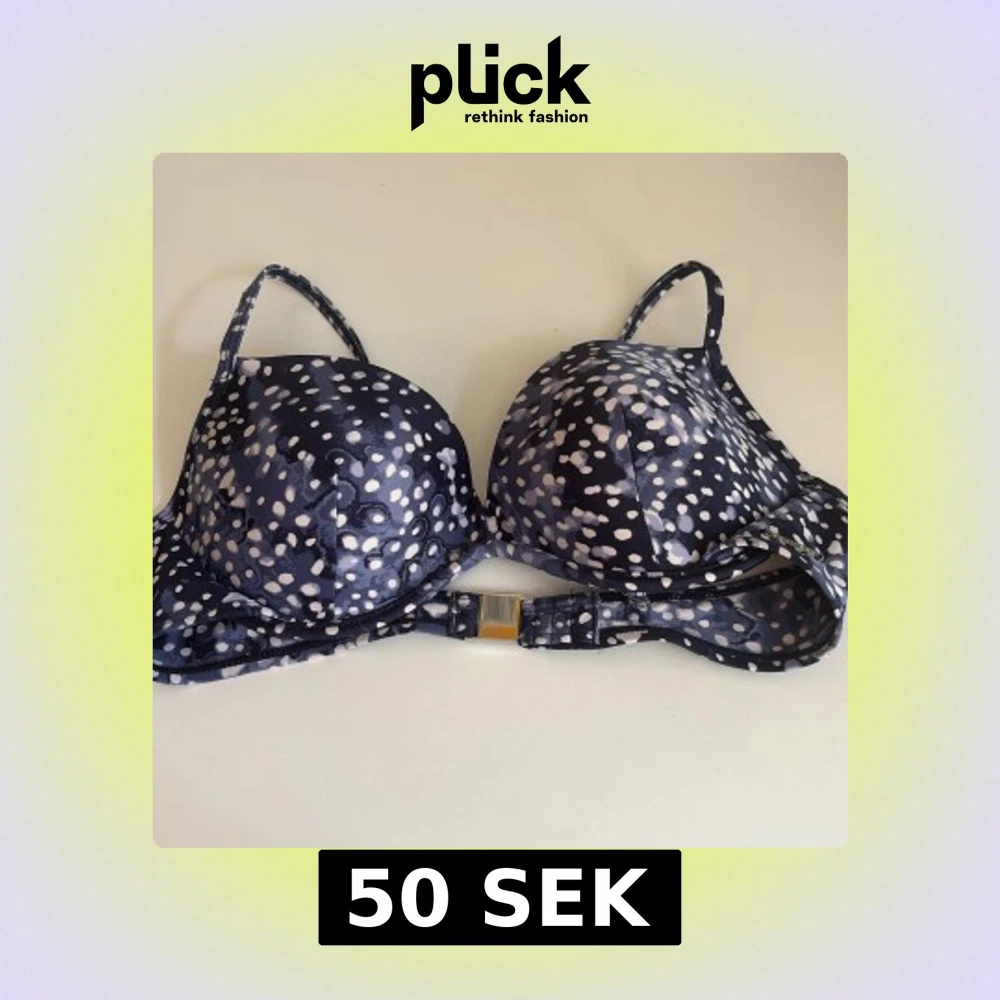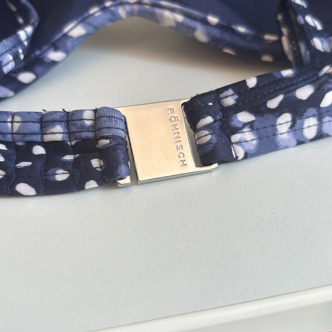 Oanvänd mörkblå bikinitopp från Röhnisch med vita prickar och justerbara axelband. Vadderade kupor. Metalknäppning baktill med logga på. Stl. S. Köparen står för fraktkostnad.