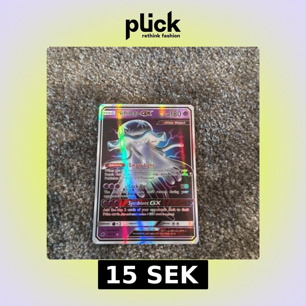 Säljer ett holografiskt Nihilego GX Ultra Beast Pokémonkort med 180 HP. Kortet har färgstark holoeffekt och visar Nihilego i blått och vitt. Text och attacker syns tydligt på framsidan. Baksidan har klassisk Pokémon-design med Pokéball.