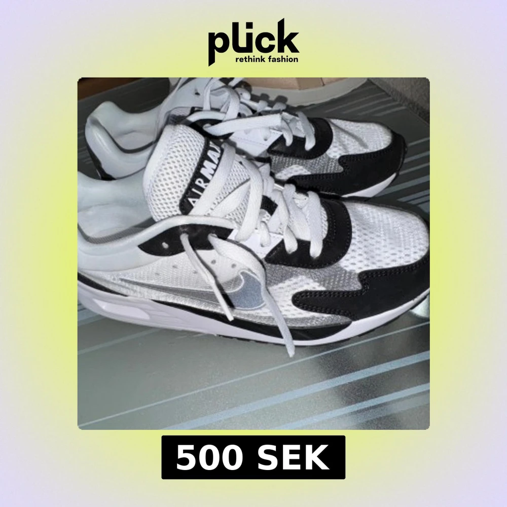 Säljer ett par Nike Air Max sneakers i svart och vitt med mesh-överdel och klassisk Air Max-detalj i sulan. Skorna har vita skosnören och en tydlig Nike Swoosh på sidan. Perfekta för dig som gillar sportig stil.