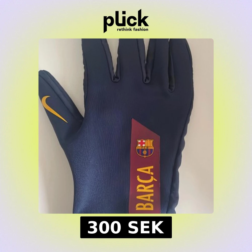 Mörkblåa handskar med FC Barcelona-logga och texten 'BARÇA' i gult på ovansidan. Handskarna har även en gul Nike-swoosh på sidan av handen. Perfekta för fotbollsträning under kyligare dagar.