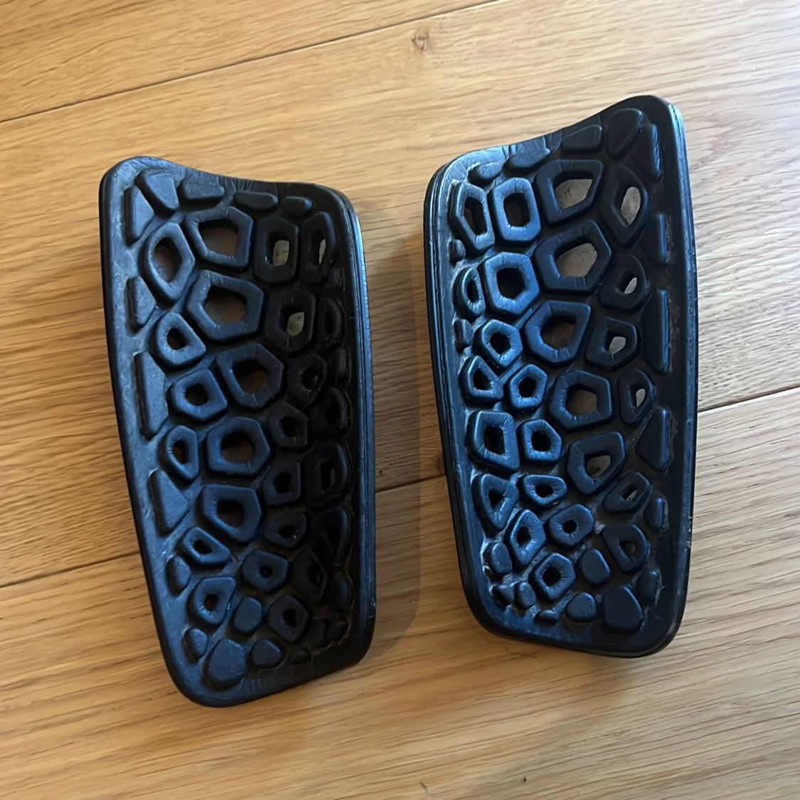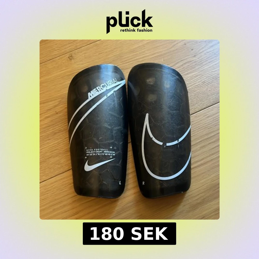 Säljer ett par svarta Nike Mercurial benskydd med vit logga och coolt hexagonmönster. De är formade för att sitta skönt på benet och har en slitstark yta med snygga detaljer. Perfekt för dig som vill ha stil och skydd på fotbollsplanen.
