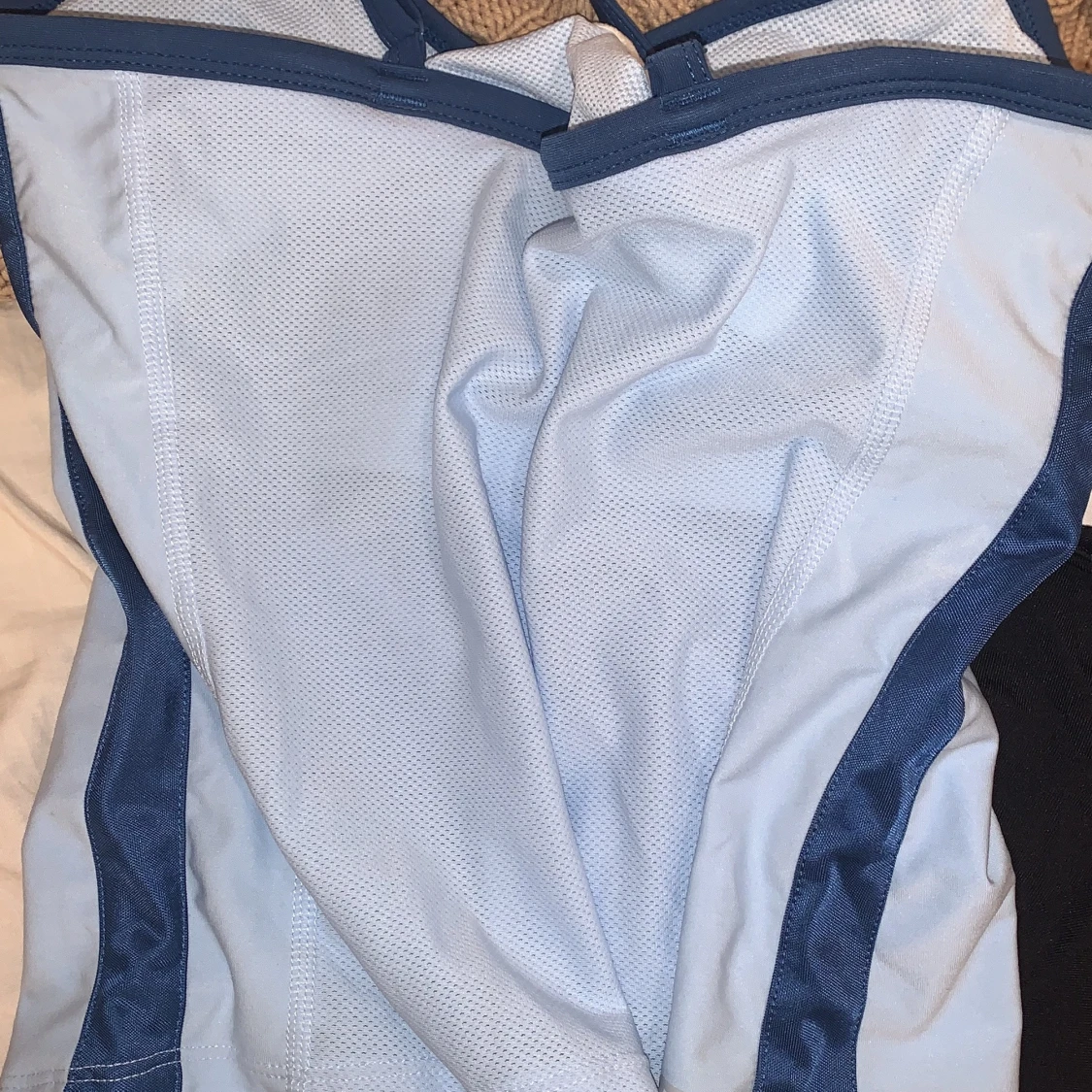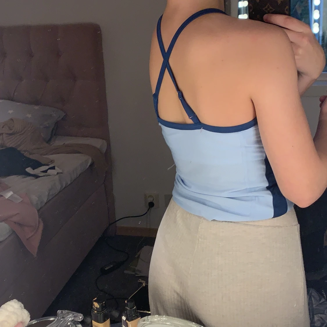 SUPER FINT linne i ljus och mörkblå!! Ett special designat träninglinne som är köpt från Singapore<3💛☺️ som inte längre finns kvar<33😍Superfint och stretchigt att ha en vanlig dag eller på gymmet! Passar perfekt att matcha med blåa naglar till, dessutom är det en rejäld inbyggd bh i linnet men jag brukar även ha träningsbh under😍💞Nypris: 499kr Linnet är i storlek L men jag som vanligtvis har xs/S/M kan ha detta linne men sitter mer som en S/M på mig<33 💕BJUDER FRAKT💕