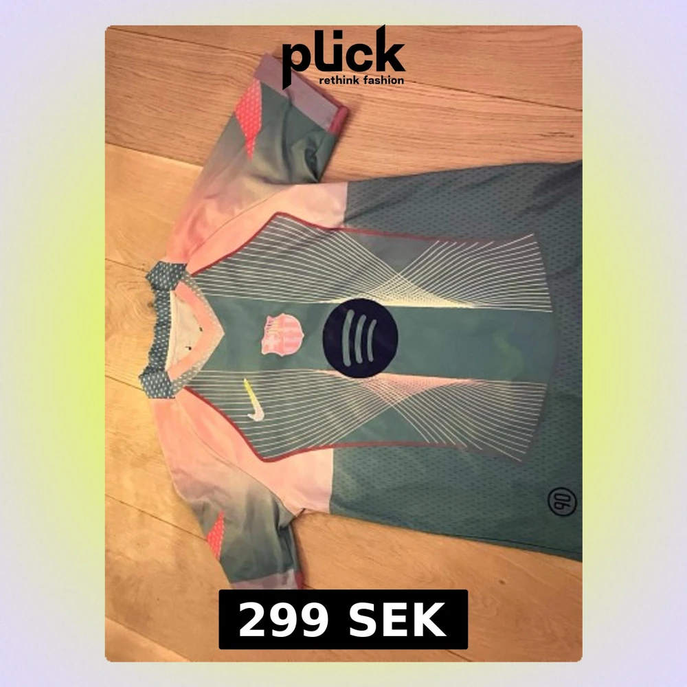 Säljer en FC Barcelona fotbolls T-shirt med Lamine Yamal och nummer 10 på ryggen. Västen har coola färgskiftningar i blått och rosa med vita linjemönster och tryckta loggor. Materialet är lätt polyester, perfekt för fotbollsträning eller bara chilla i hemmet