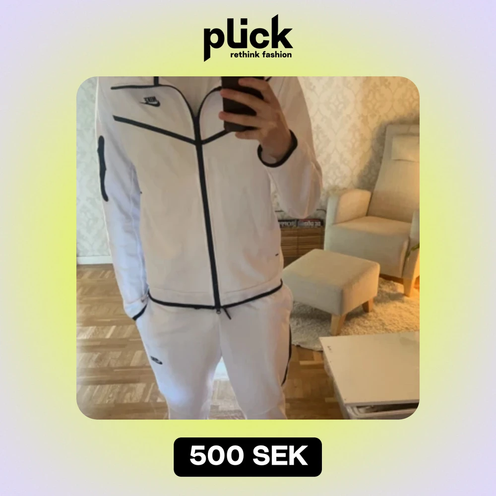 Vit Nike tech den är i helt okej skick. Jätte fin vit och fräch dress. Den passar dig om du är från 175-185. Till mig passar den bra och ja är 183.