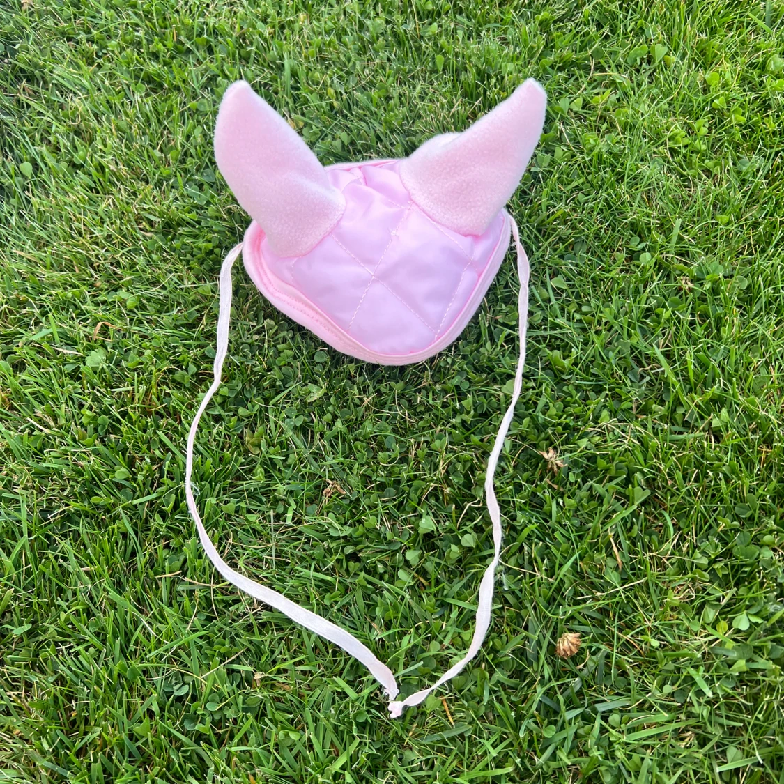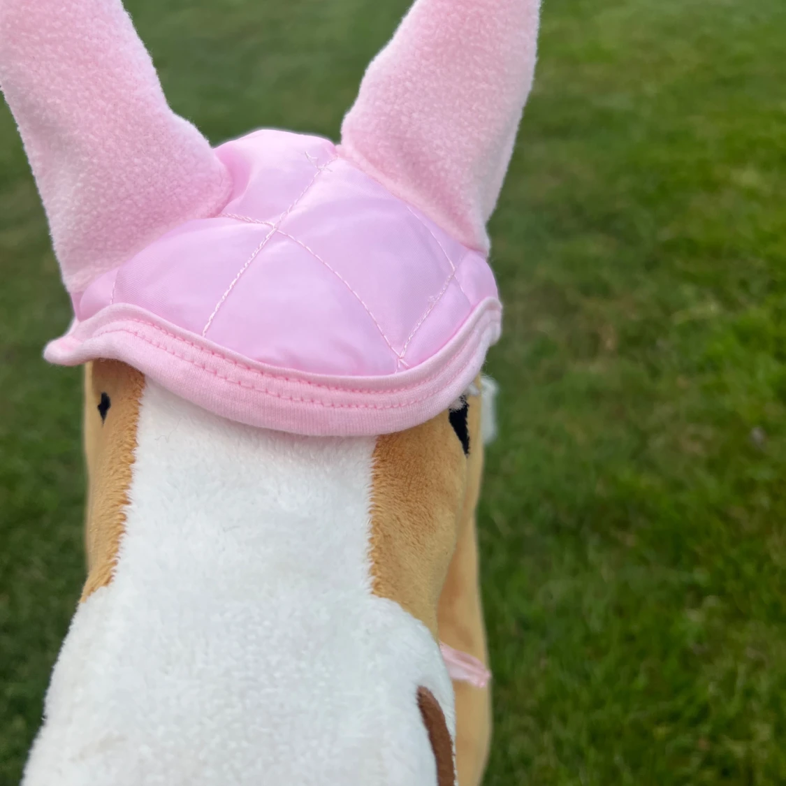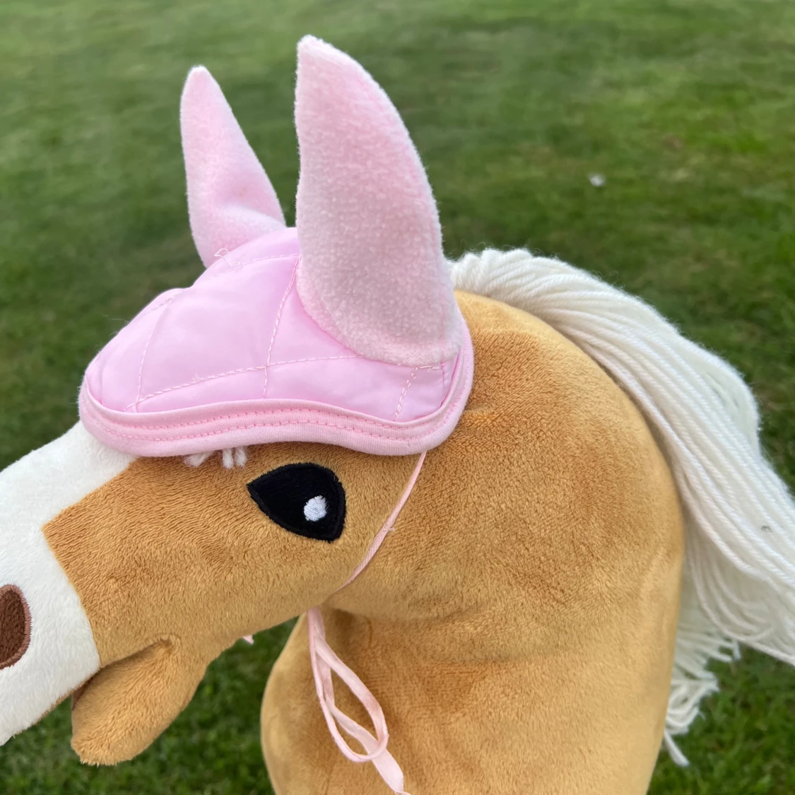 Säljer en söt rosa huva till käpphäst med två mjuka öron. Huvan är quiltad och har snörning under hakan för enkel fastsättning. Materialet är en blandning av syntet och fleece, vilket gör den både mjuk och lätt. Perfekt för dig som gillar ridning och vill ge din käpphäst extra stil.