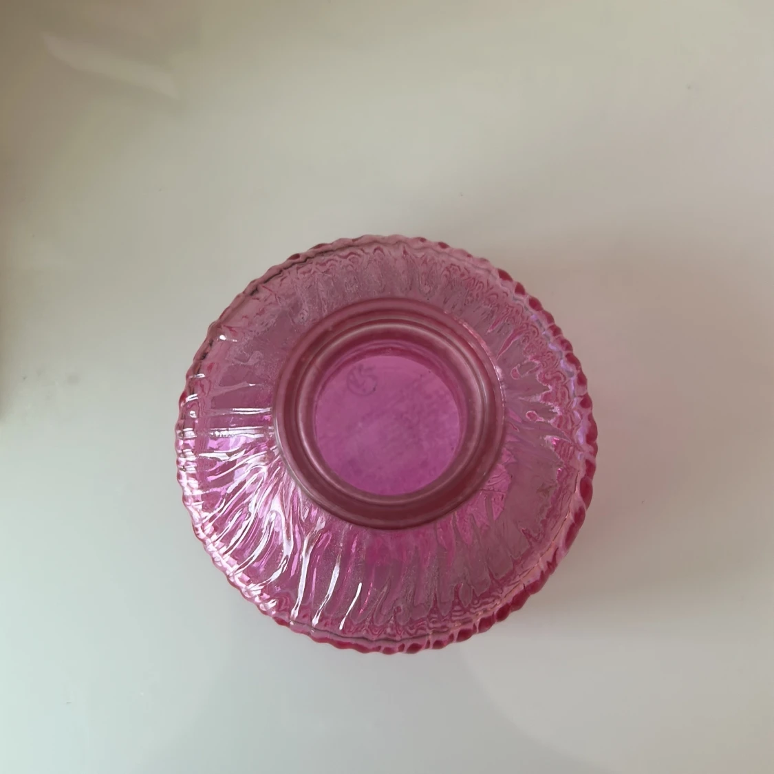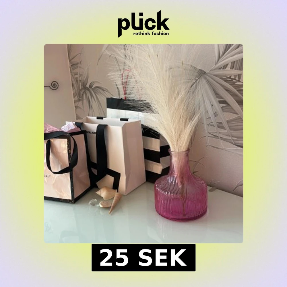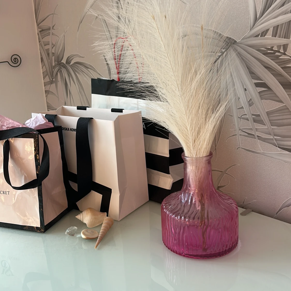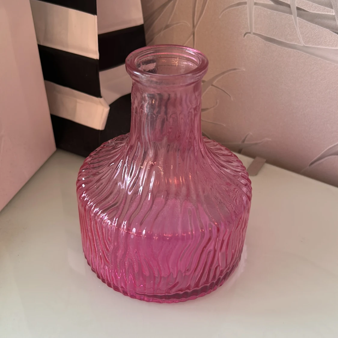 Bilderna visar en dekorativ rosa glasvas med vågig struktur. Vasen är i fint skick utan synliga sprickor eller skador och passar perfekt som inredningsdetalj för blommor eller pampasgräs. Den har en bred botten och smal hals, vilket ger ett modernt och stilrent uttryck.