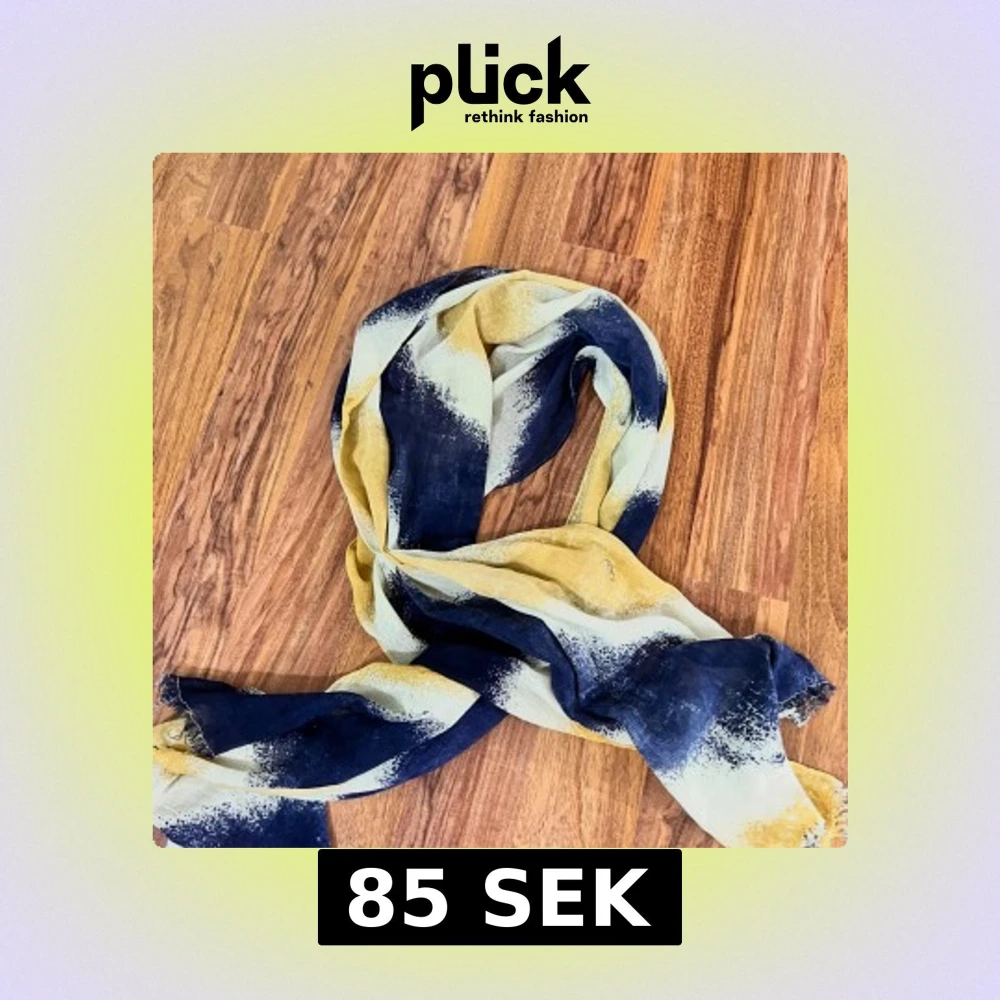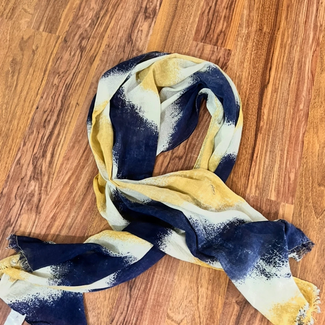Snygg halsduk med breda, randiga fält i marinblått, gult och vitt. Mjukt och lätt material som gör den enkel att styla runt halsen eller över axlarna. Perfekt accessoar för att lyfta din outfit med lite färg och mönster.