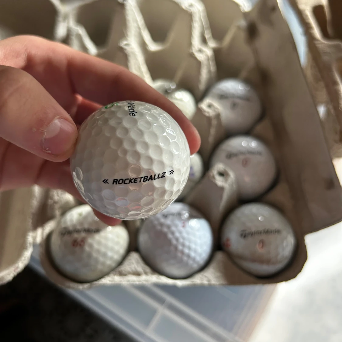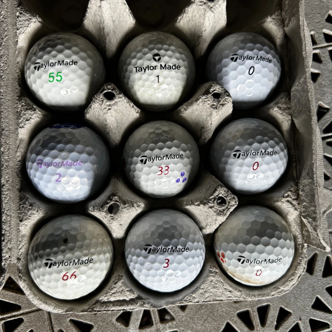 Sats med 9 TaylorMade Rocketballz golfbollar i blandade nummer. Bollarna är i gott begagnat skick med mindre tecken på användning. Perfekta för träning eller spel. Inga större skador synliga, vissa bollar har mindre märken eller färgmarkeringar.