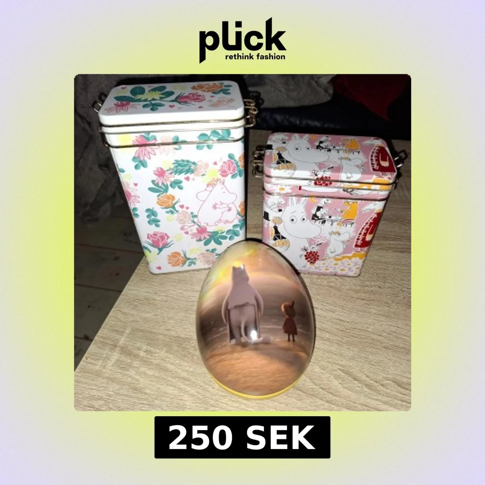 Bilderna visar fina Mumin-burkar och ett Mumin-påskägg, perfekta för samlare eller som dekoration. Burkarna har färgglada motiv med Mumin och vänner, och ser ut att vara i mycket gott skick utan synligt slitage. Perfekt för förvaring eller som present.