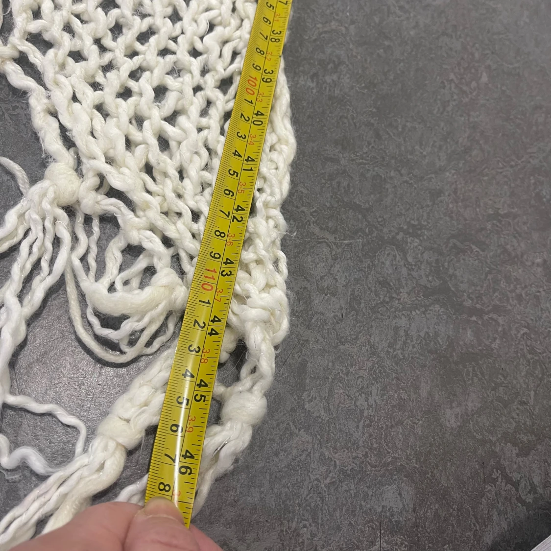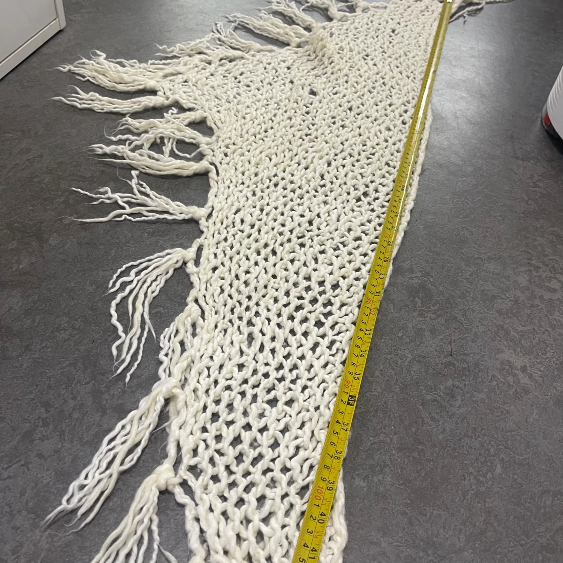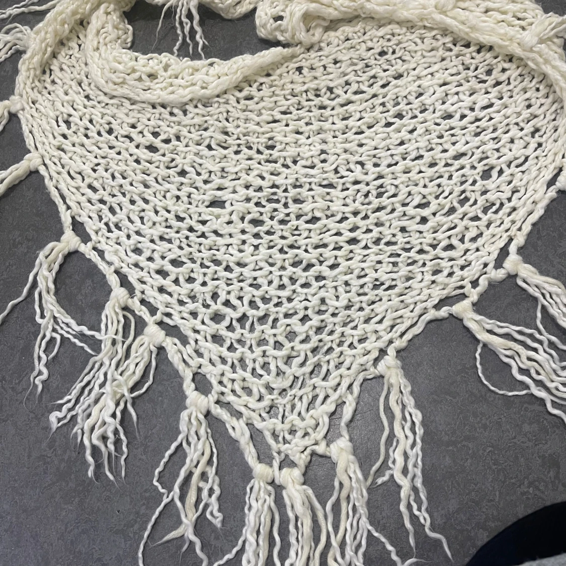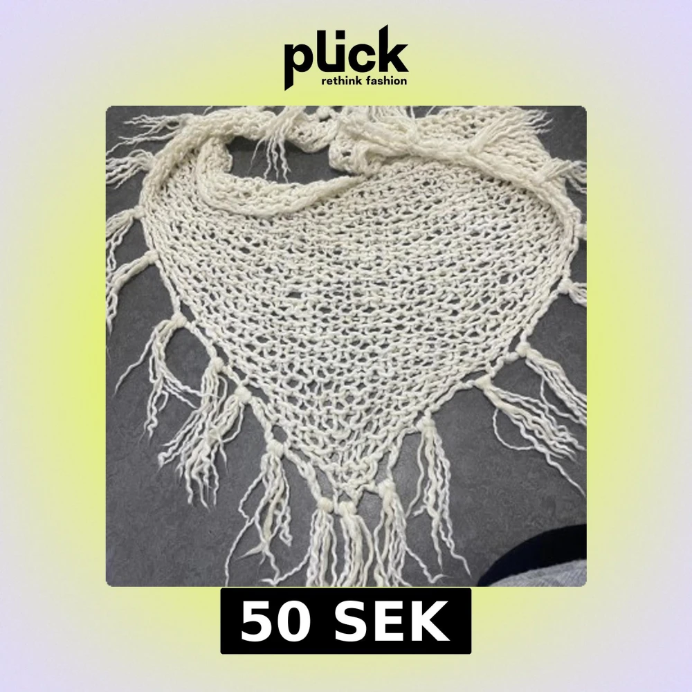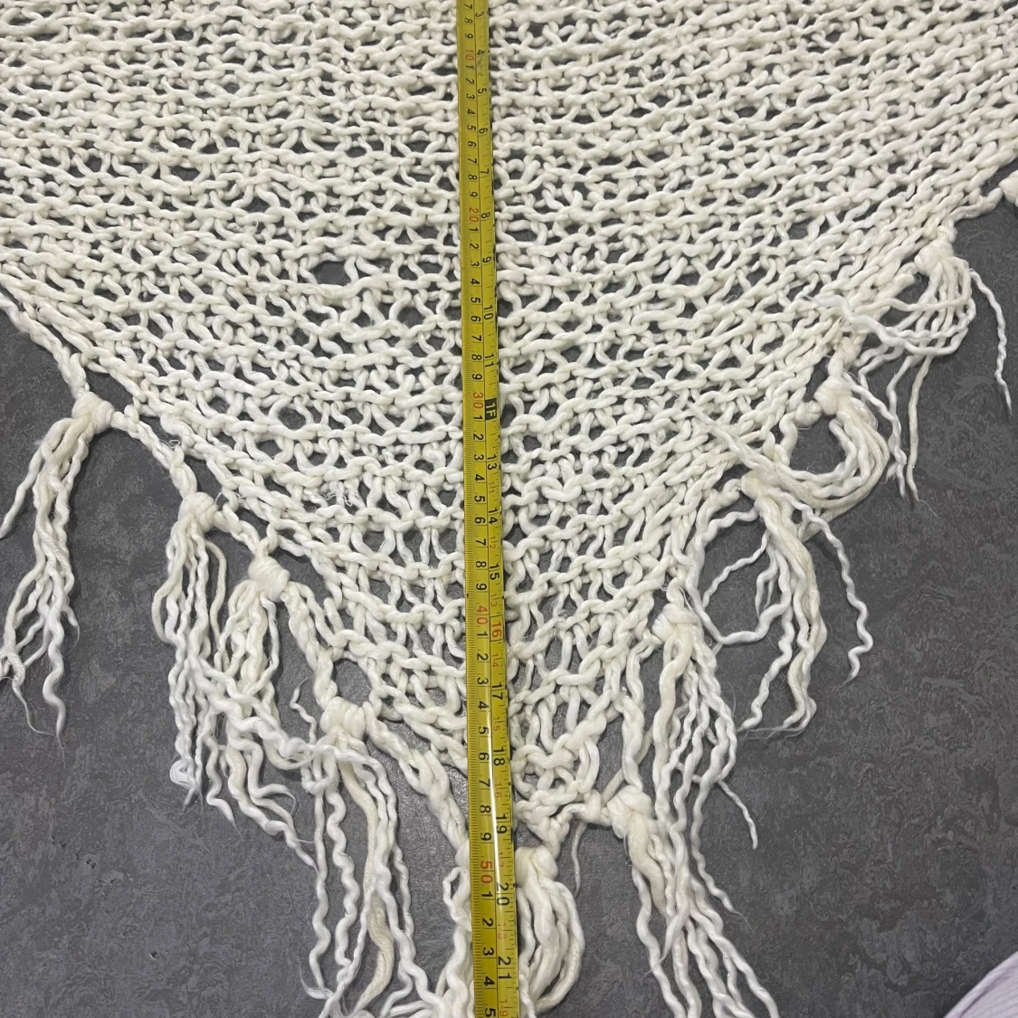 Säljer en vit, grovstickad trekantig halsduk med långa fransar längs kanterna. Halsduken har en luftig och bohemisk känsla, perfekt att slänga över axlarna för en chill look. Mjuk och skön, passar dig som gillar unika accessoarer.
