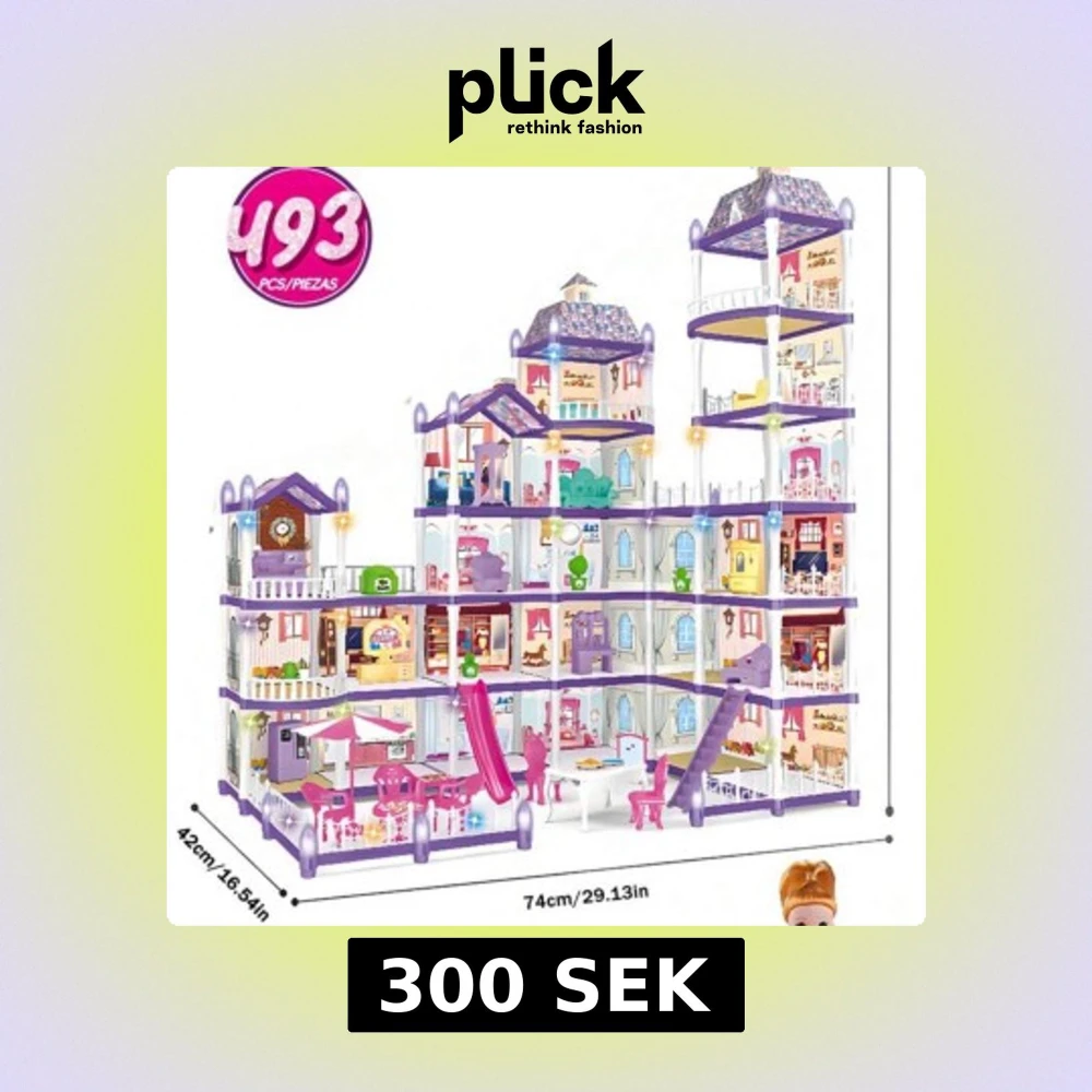 Stort och detaljerat dockhus med 493 delar. Huset har flera våningar och rum, inklusive en rutschkana och möbler. Perfekt för kreativ lek och inredning. Mått: 74 cm x 42 cm.