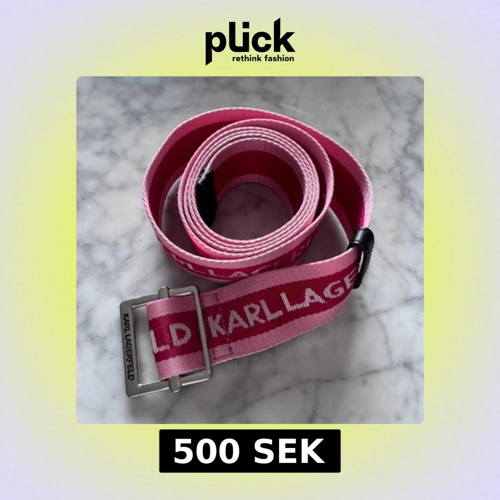 Säljer ett rosa bälte från Karl Lagerfeld med tydlig logga längs hela bandet. Bältet har en silverfärgad metallspänne och är gjort i ett slitstarkt tygmaterial. Perfekt för att ge outfiten en färgklick.