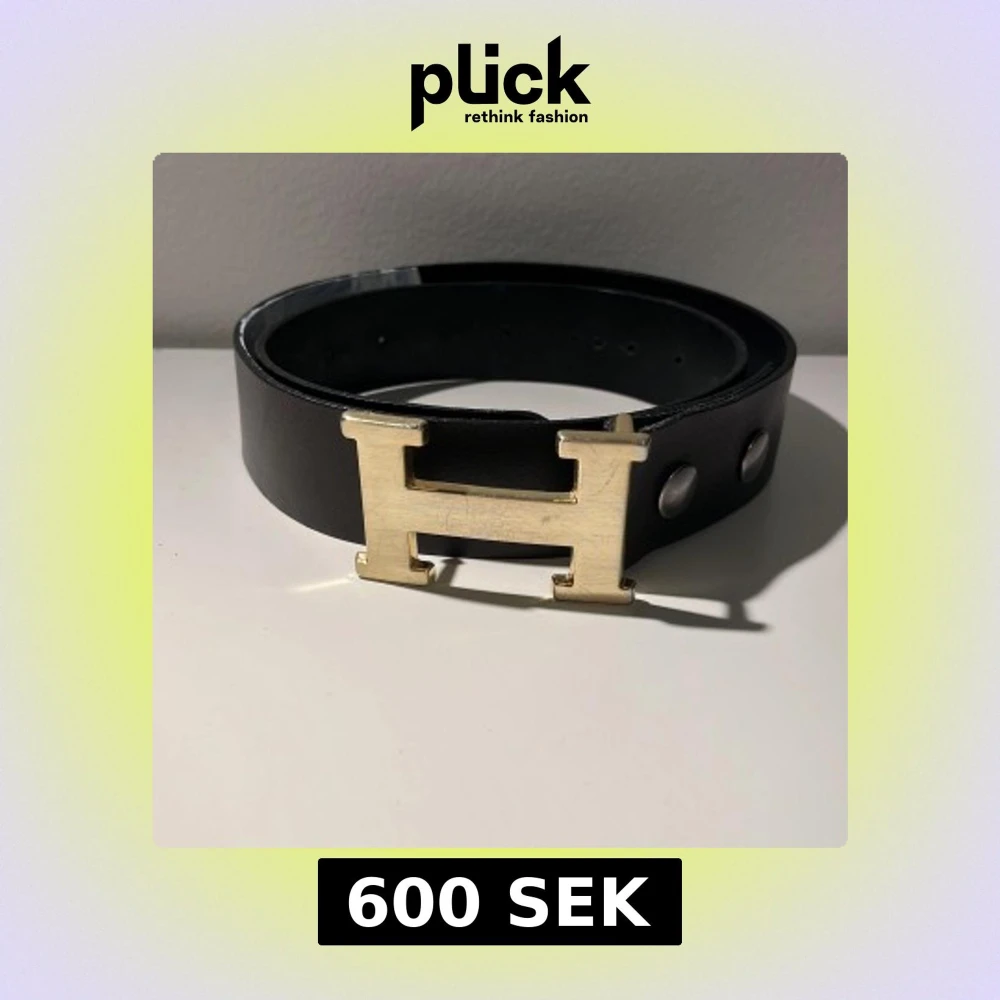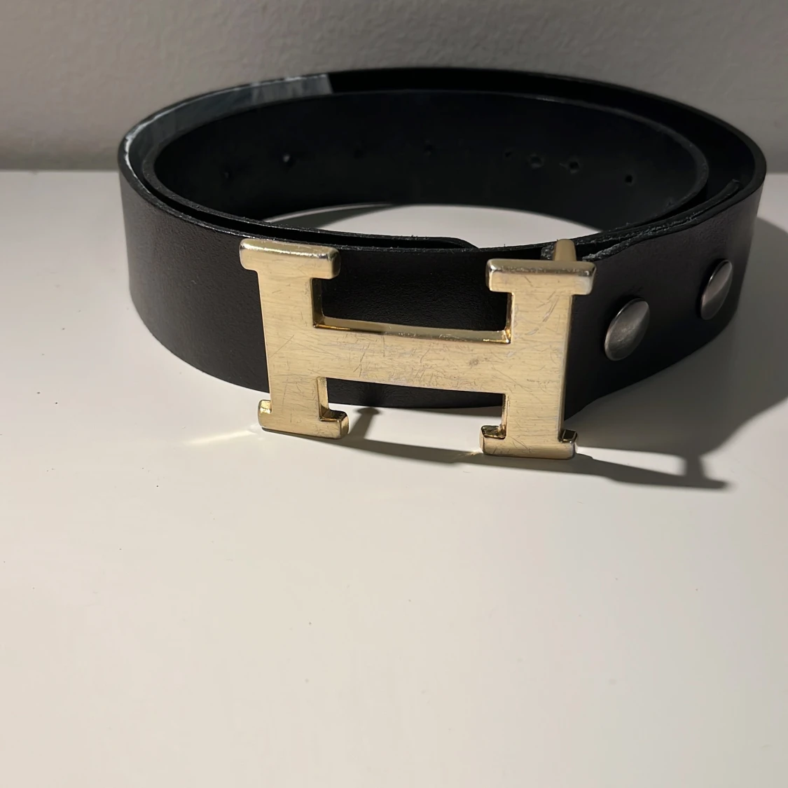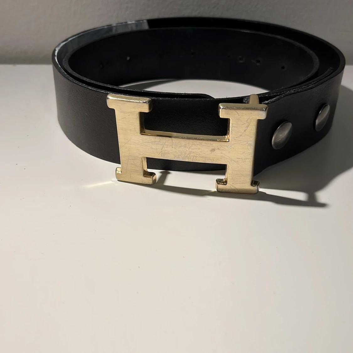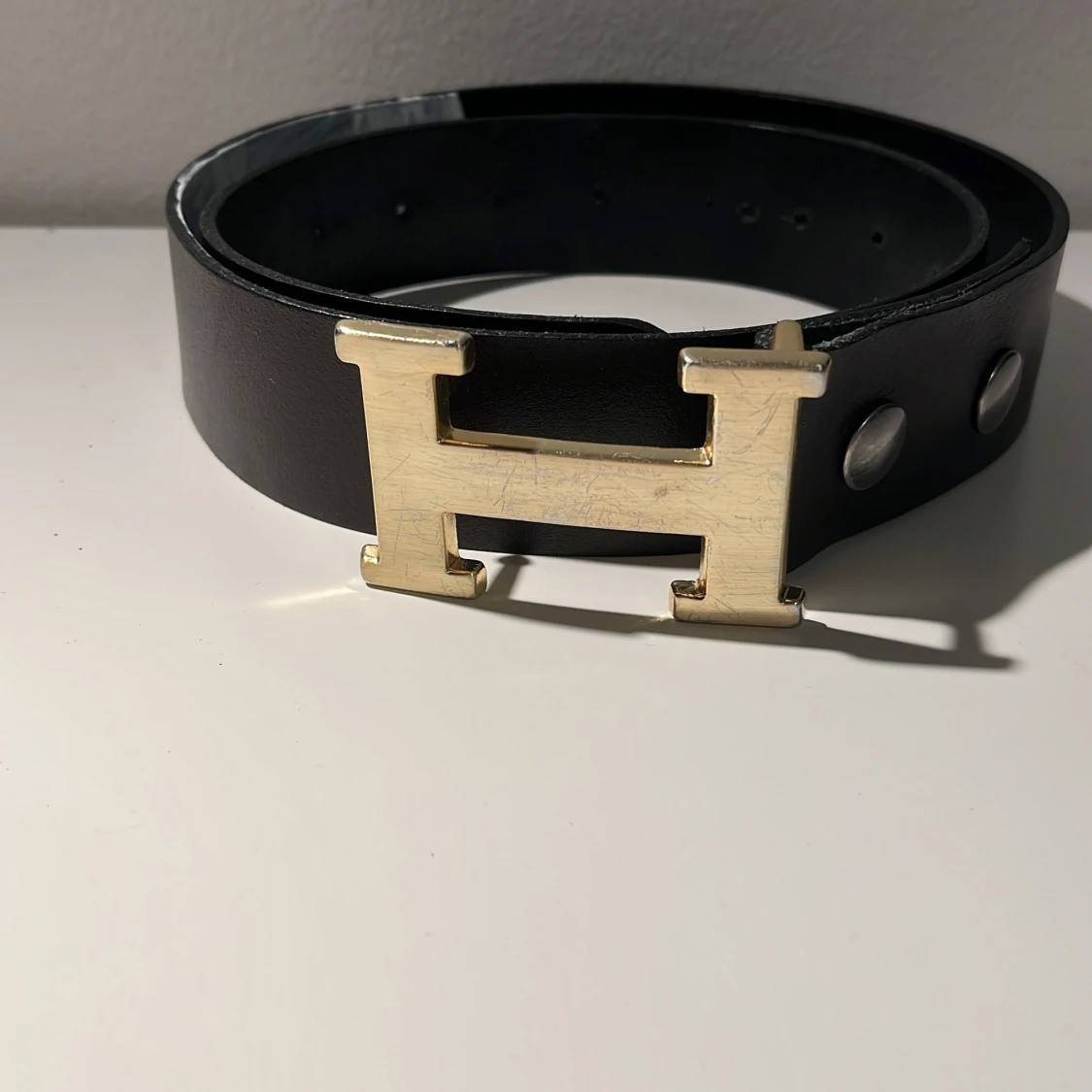 Snyggt svart bälte med ett stort, guldigt H-format spänne. Bältet har en stilren design och är gjort i ett slätt material med två metallnitar vid sidan av spännet. Perfekt accessoar för att lyfta din outfit.