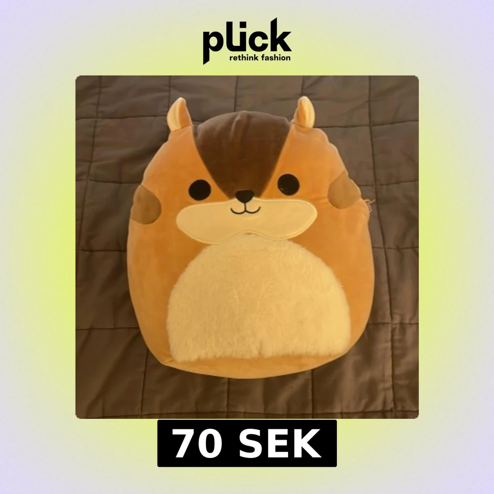 Supermjuk och gosig Squishmallow i form av en ekorre som heter Melzie. Den har bruna och beige färger, stora svarta ögon, rund mage och en fluffig svans. Perfekt som kramdjur eller dekoration i sängen.