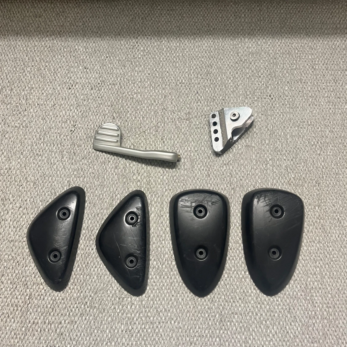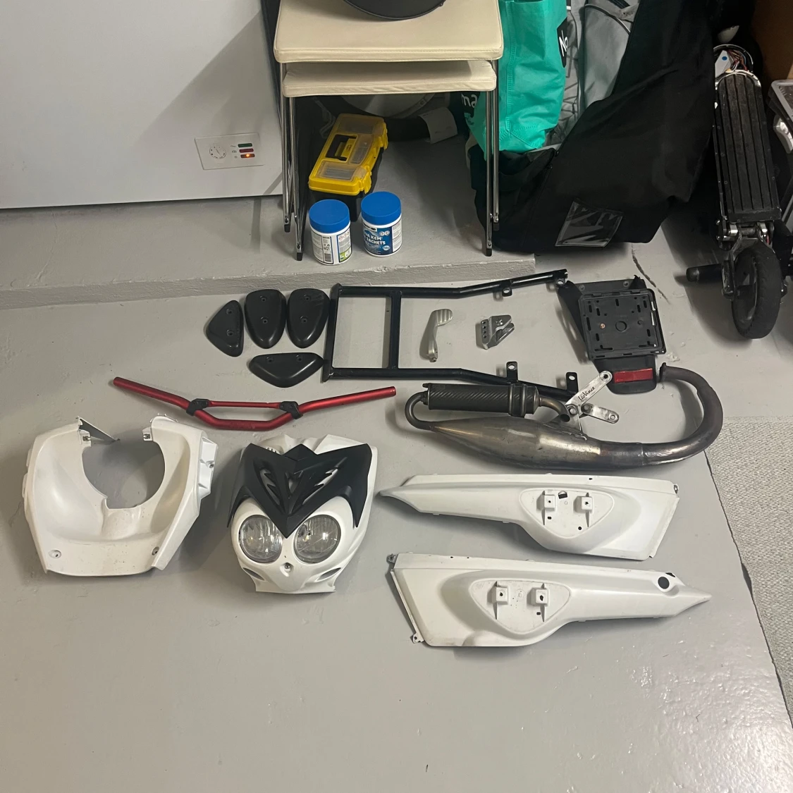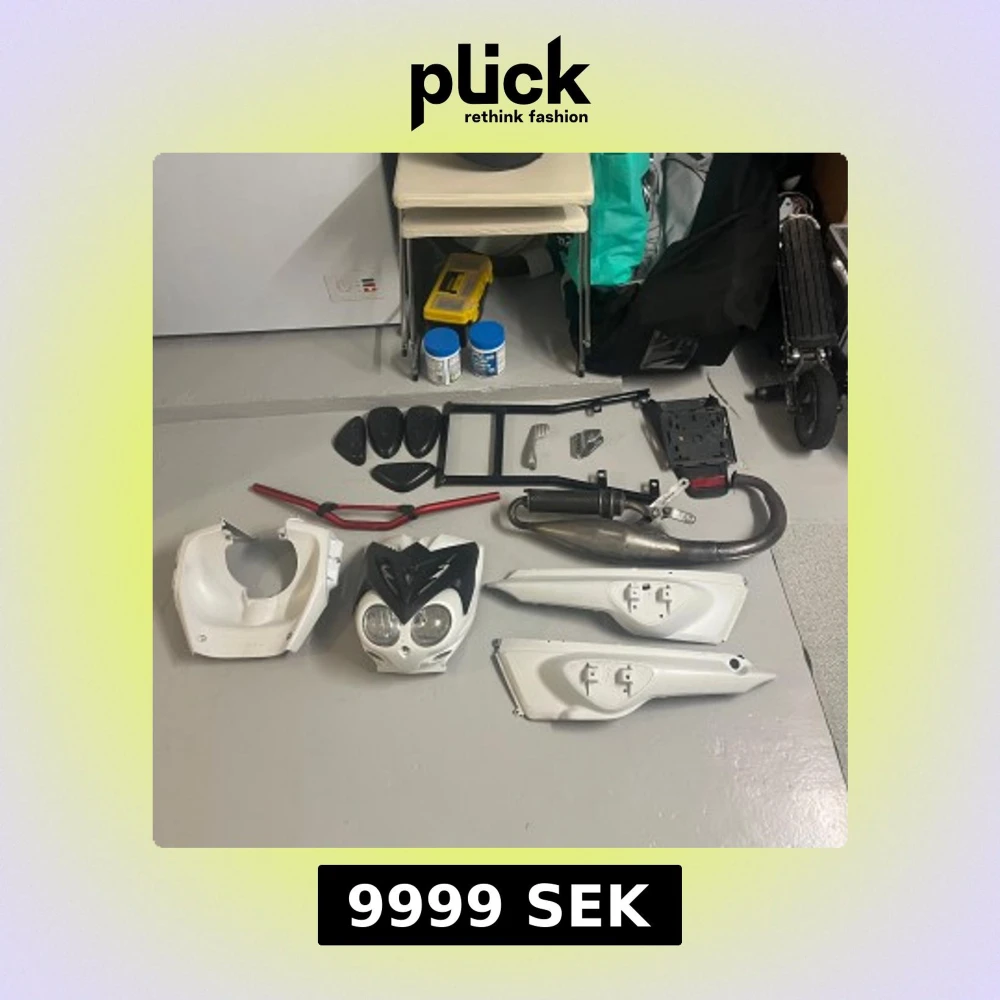 Bilderna visar olika delar och kåpor till en Yamaha slider, kåpor, styre och avgassystem. Perfekt för dig som gillar att meka och vill ge ditt fordon en ny look eller behöver reservdelar. Passar dig som är intresserad av fordon och motorer. De är bara å buda, bara å fråga om ni undrar, har också ett annat rör och mer andra kåpor och små delar så de är bara å fråga om ni undrar nåt