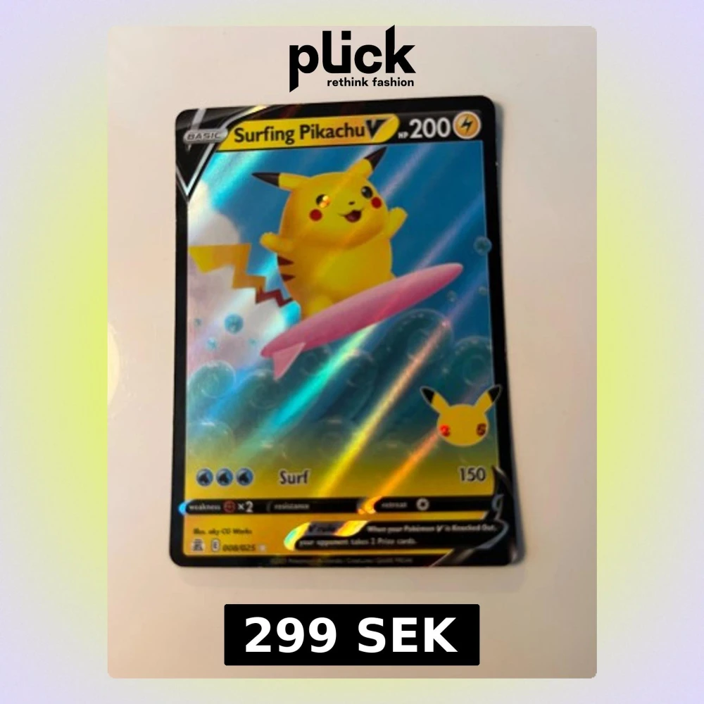 Coolt Pokémonkort med Surfing Pikachu V! Pikachu surfar på en rosa bräda över vågorna, perfekt för samlare och fans. Kortet har en glansig finish och är en rolig detalj i din Pokémon-samling. Passar både unga och unga vuxna som älskar Pokémon.