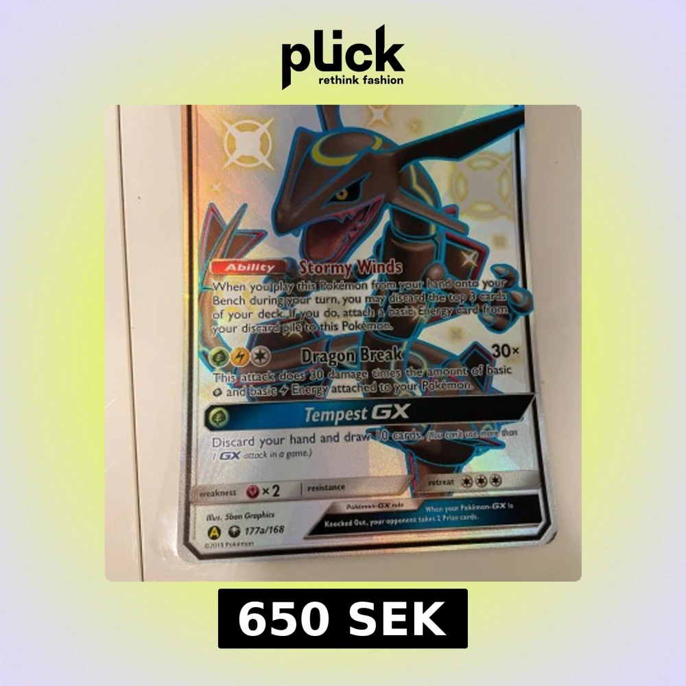 Cool och glittrig Rayquaza GX Pokémonkort! Perfekt för samlare och spelare som vill boosta sitt deck med en legendarisk drake. Kortet har unika attacker och en snygg holo-effekt som gör det extra speciellt. Ett måste för alla Pokémon-fans!