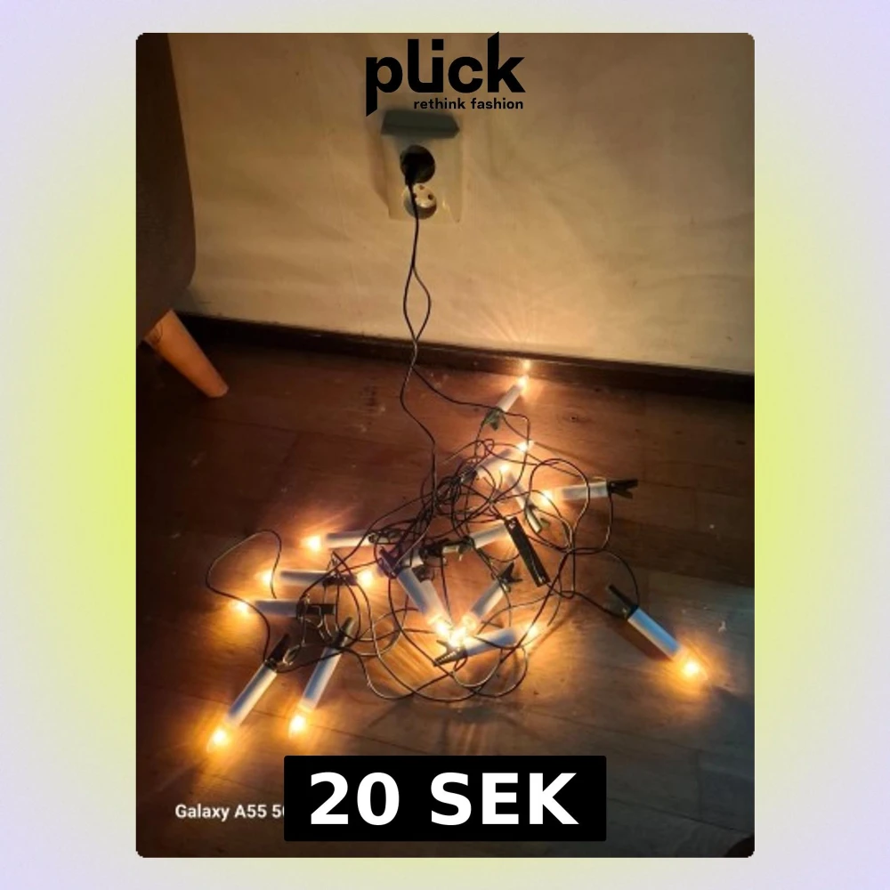 Elektrisk ljusslinga med flera vita plastljus och gröna klämmor för enkel upphängning. Slingan har svart sladd och kopplas in med vanlig stickkontakt. Perfekt för att skapa mysig stämning i hemmet, särskilt under vintern.