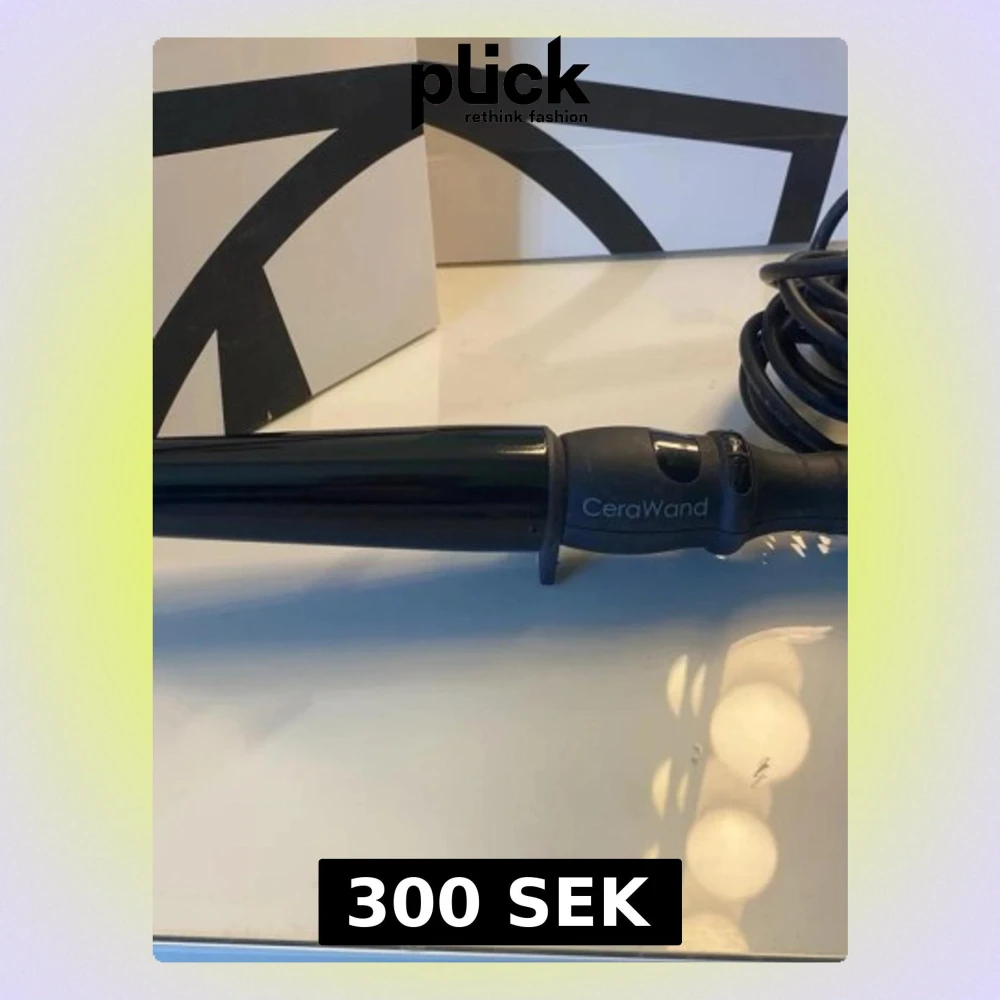 Säljer en svart locktång från CeraWand med sladd och ergonomiskt handtag. Tången har en konformad form och är tillverkad i plast och metall, perfekt för att fixa snygga lockar snabbt och enkelt.