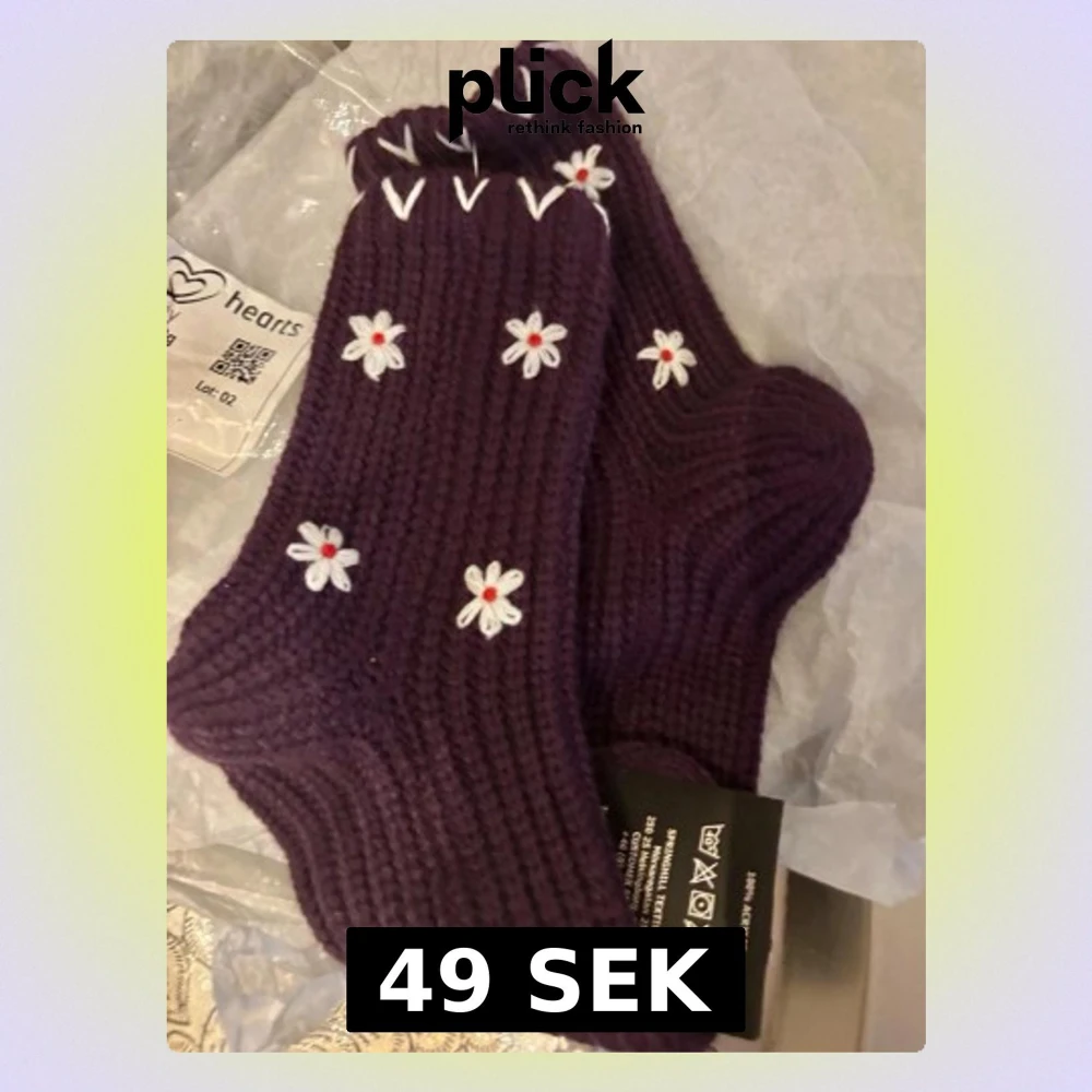 Mysiga lila stickade strumpor med broderade vita blommor och små vita blommor detaljer. Strumporna har ribbad struktur och dekorativa vita sömmar upptill. Perfekta för att addera lite färg och mönster till din outfit. Sköna mjuka. * leveranstid 1-3 vardagar kontakta mig gärna innan köp mvh Anna 🫶 🌸💮🫶