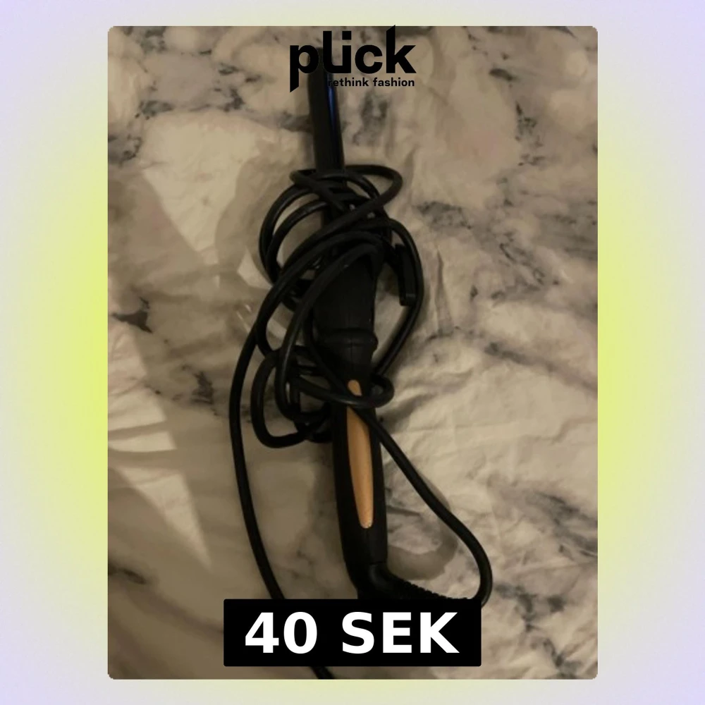 En svart locktång med beige detalj på handtaget. Locktången har en sladd som är virad runt handtaget och ett smalt värmeelement. Perfekt för att styla håret och skapa lockar.