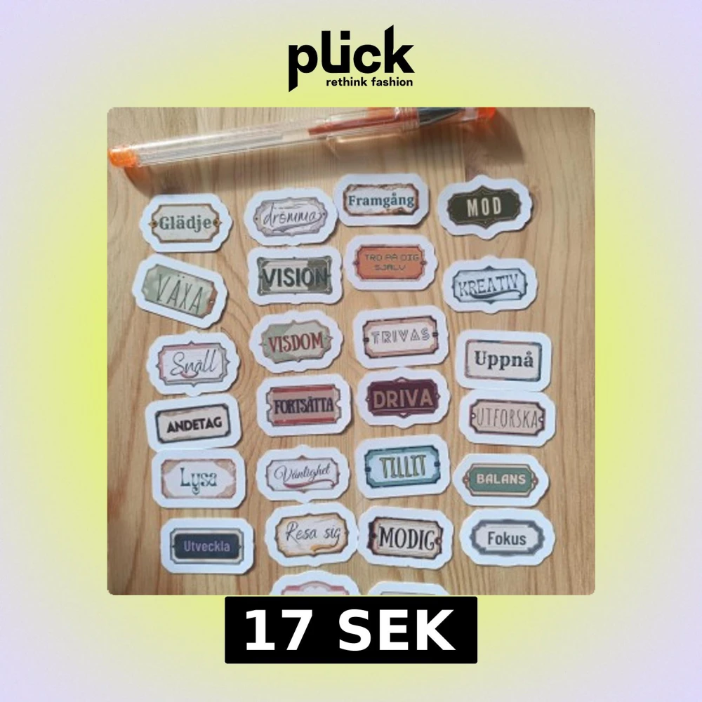 Ett ark med inspirerande klistermärken med ord som 'Glädje', 'Vision', 'Kreativ', 'Modig' och fler. Perfekt för att peppa dig själv, dekorera anteckningsböcker eller ge bort till en vän. Skapa motivation och sprid positiv energi i vardagen!