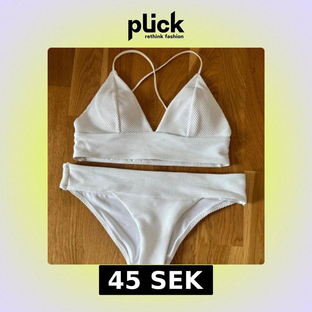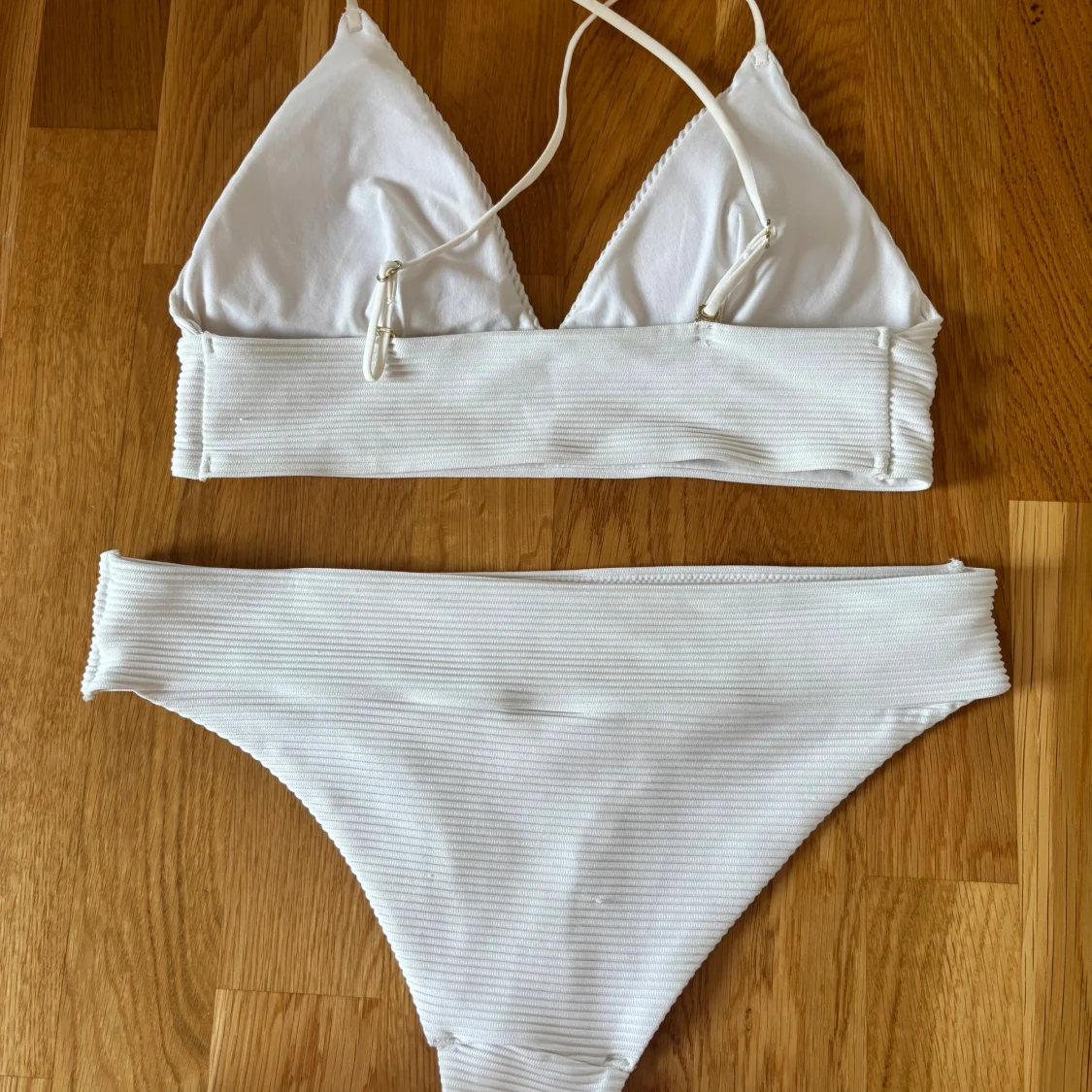 Säljer en stilren vit bikini med ribbad struktur och guldiga detaljer. Överdelen har trekantskupor och smala axelband som korsas i ryggen. Underdelen är klassisk med bredare kant upptill. Perfekt för stranden eller poolen på sommarn eller semester eller varför inte nu i kylan i en go yacutsy eller bastu. Passar str 34-38