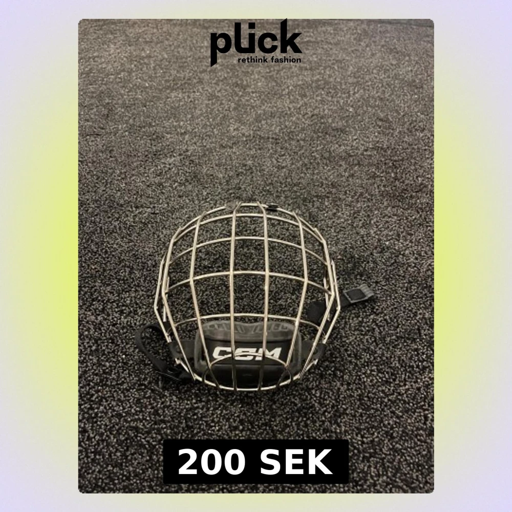 Säljer ett robust hockeygaller från CCM i silverfärgad metall med svart hakskydd och justerbara remmar. Gallret har en klassisk fyrkantig form och passar perfekt till hockeyhjälm för extra skydd på isen.