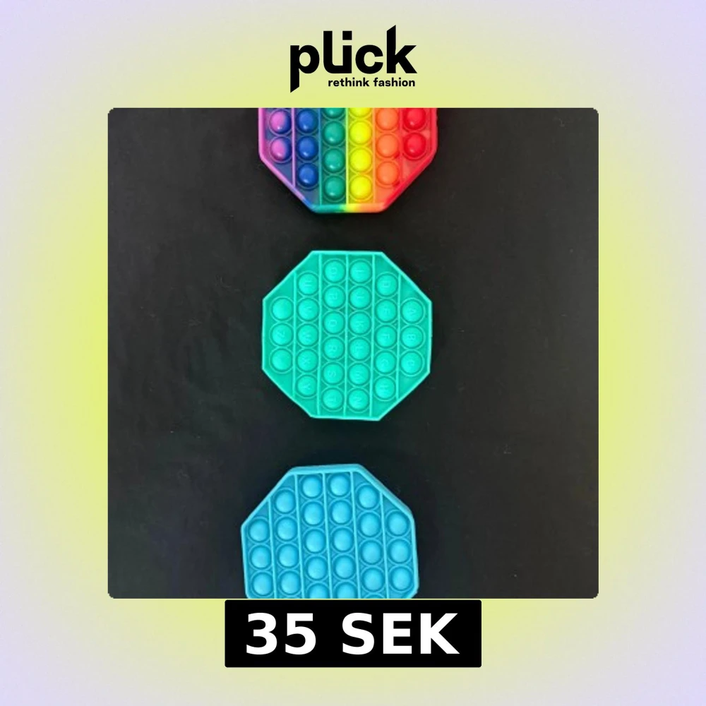 Säljer tre pop it-leksaker i silikon. En är regnbågsfärgad med åtta kanter, en är turkos och en är ljusblå, båda med åtta kanter. Perfekt för att stressa ner eller bara ha kul med kompisar.