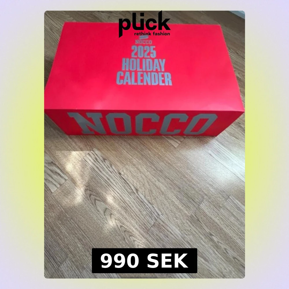 Stor röd box från NOCCO med texten '2025 Holiday Calender' i vitt.3D-tryck på sidan med NOCCO-loggan. Perfekt för dig som gillar energidrycker och vill ha en unik kalender till högtider.