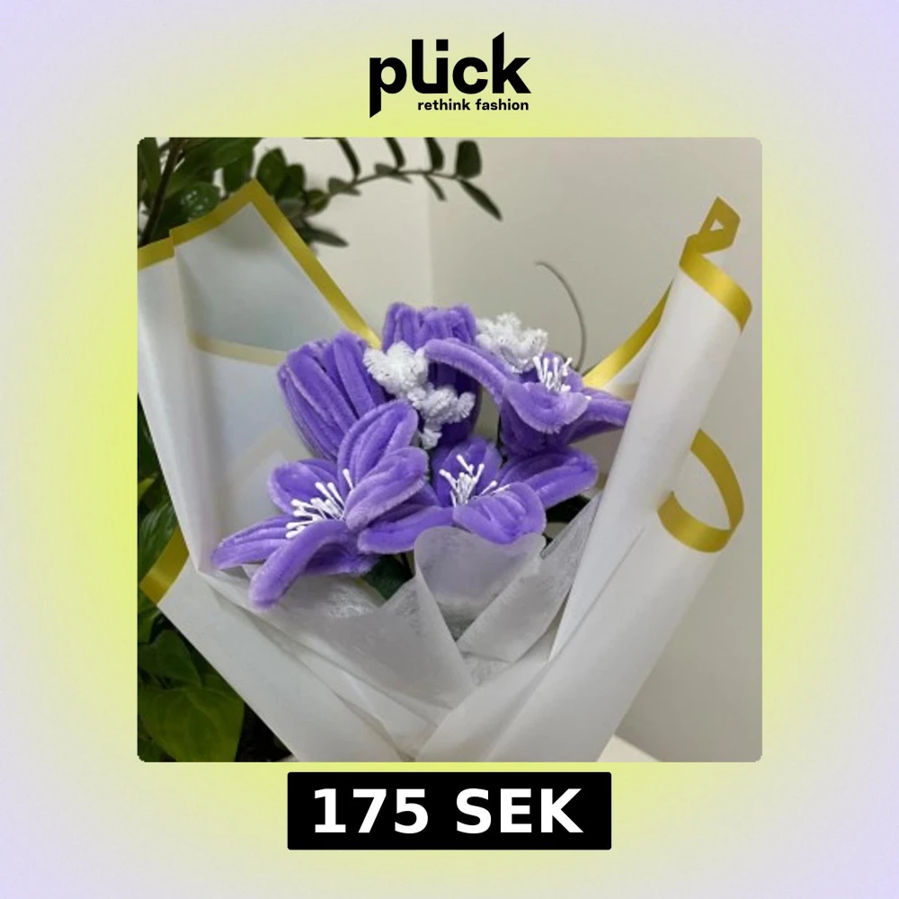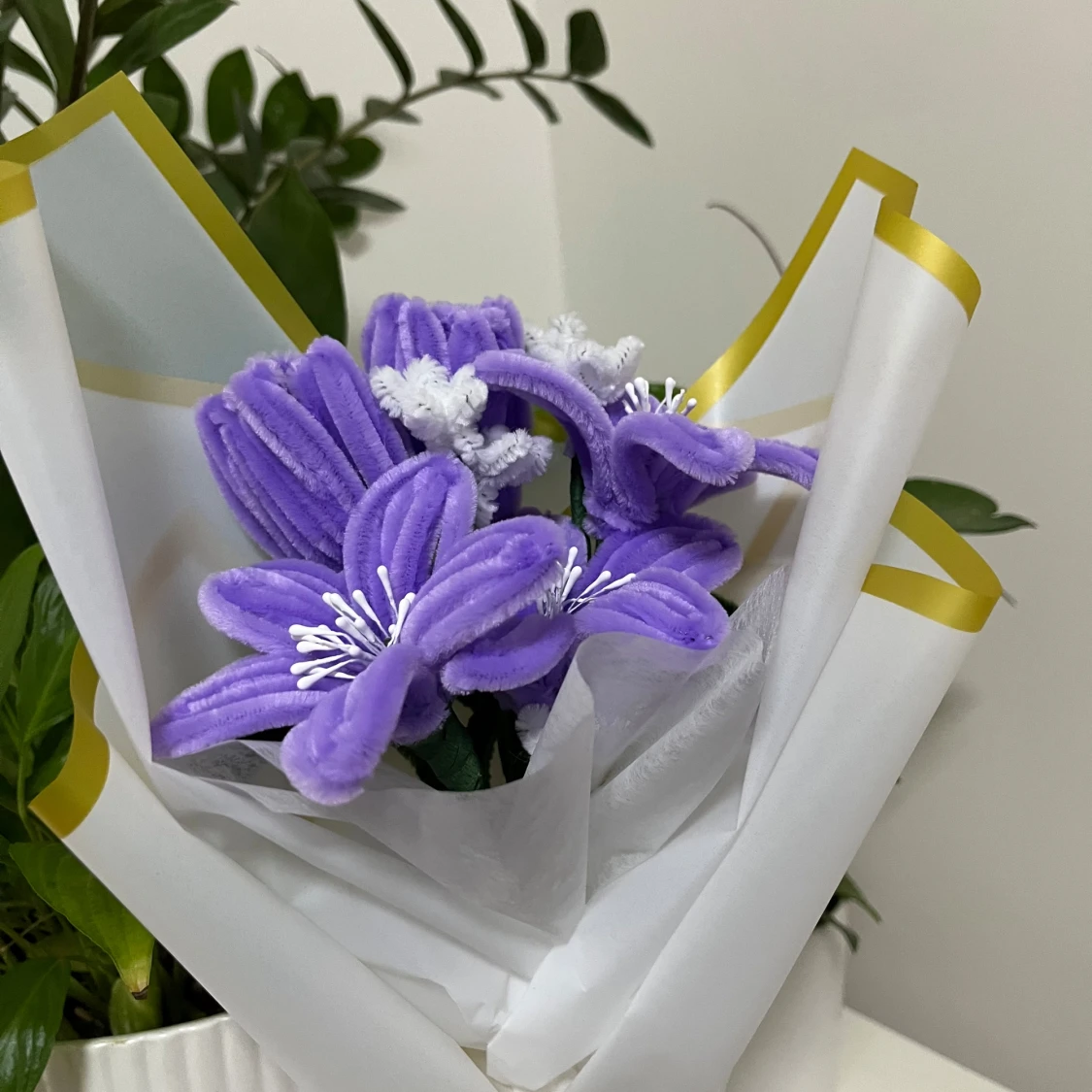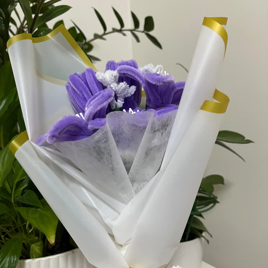 Bilderna visar en bukett med lila och vita blommor gjorda av piprensare, inslagna i vitt papper med guldkant. Konstgjorda blommor som kan anvÀndas som dekoration eller present.