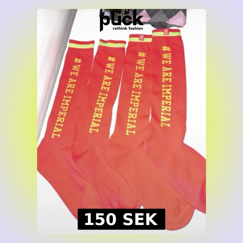 Säljer fyra par röda knästrumpor från Imperial med texten '#WE ARE IMPERIAL' i gult längs benet. Strumporna har en grön och gul rand upptill och är perfekta för dig som vill sticka ut. Materialet känns mjukt och stretchigt. Även finns det ett par vanliga rid strumpor.