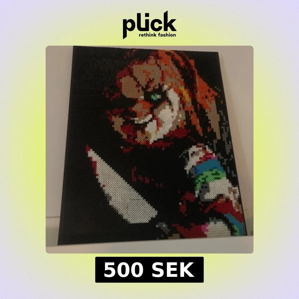 En pärlplatta med ett skräckmotiv i olika färger, inklusive svart, rött, vitt och grönt. Motivet föreställer en figur med en kniv, vilket ger en dramatisk och spännande känsla. Perfekt för den som gillar skräck och unika konstverk. 50 x40 cm.