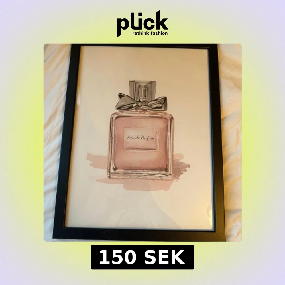Snygg tavla med illustration av en parfymflaska i rosa toner, dekorerad med en svart rosett. Motivet har texten 'Eau de Parfum' och är inramad i en svart ram. Perfekt som dekor i sovrum eller walk-in closet.