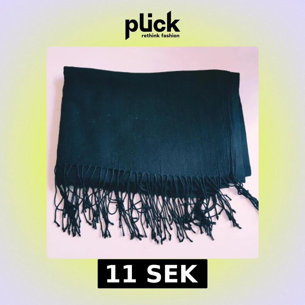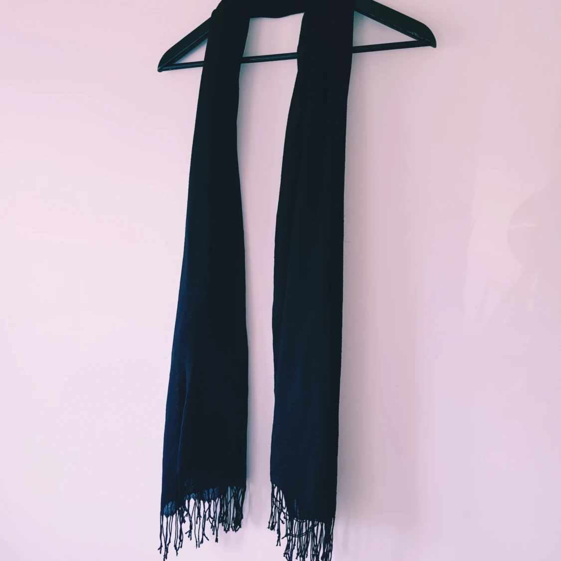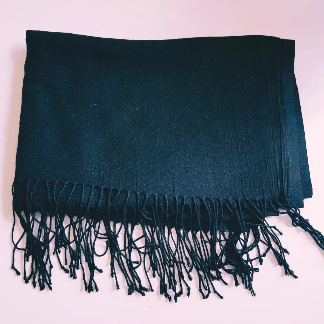 En stilren svart halsduk med långa fransar i ändarna. Halsduken är rektangulär och passar perfekt att vira flera varv runt halsen. Materialet känns mjukt och lätt, vilket gör den enkel att bära hela dagen. Helt skick dock noppror